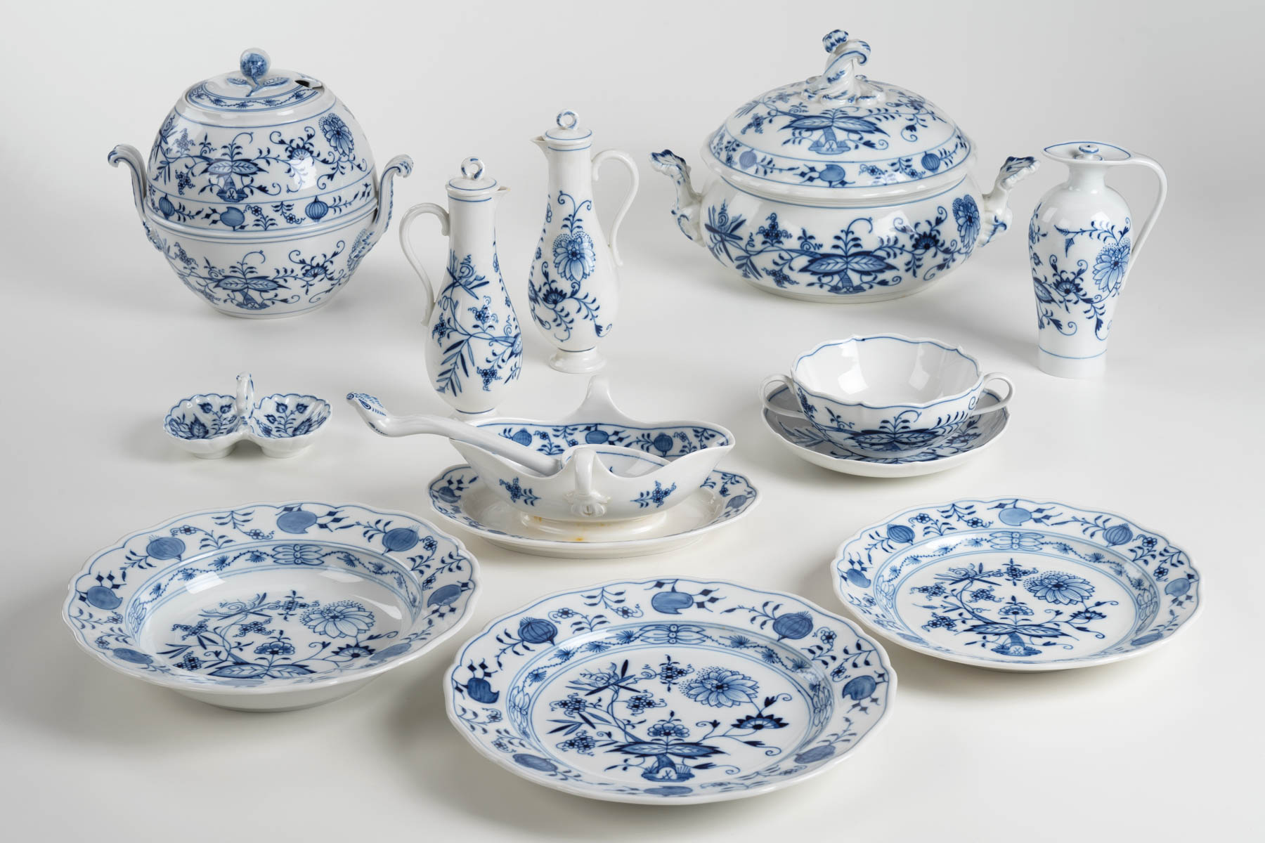 Meissen Porzellan/Porcellana Servizio da tavola Meissen con motivo Zwiebelmuster;2 diverse zuppiere, 12 piatti fondi, 12 piatti piani, 12 piatti da dessert, 12 tazze da zuppa con piattini, 1 salsiera con cucchiaio, 1 saliera e pepiera, 3 bottiglie per aceto, olio e condimento