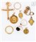 Lotto in oro 18k (750 millesimi) di medaglie religiose, due fedi nuziali, bottoni da colletto, una parure da notte con cabochon di giaietto sfaccettato e un anello con cabochon di vetro rosso.