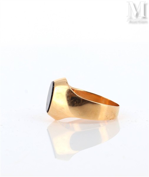 Anello con sigillo in oro giallo 18 carati (750 millesimi) ornato da un'onice ovale in montatura a massaggio.
