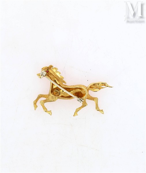 Broche en or jaune 18k (760 millièmes) figurant un cheval au galop, l'il serti d'un petit rubis rond.