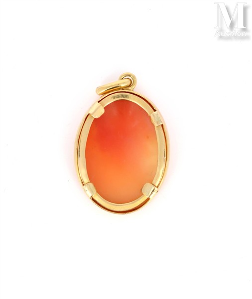Pendentif serti d'une camée coquille figurant une jeune femme en allégorie du printemps, présenté dans un cerclage en or jaune 18k (750 millièmes).