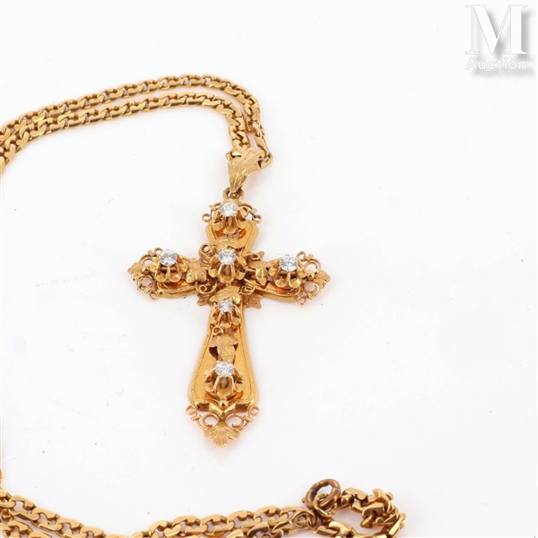 Ensemble en or jaune 18k (750 millièmes) formé d'une chaîne de cou à maille gourmette et d'un pendentif figurant une croix latine terminées par des enroulements, appliquées de feuilles de lierre et sertie de petits diamants ronds taille brillant.