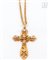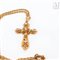 Parure in oro giallo 18 kt (750 millesimi) composta da una catena barbazzale al collo e un pendente raffigurante una croce latina terminante con spirali, applicate con foglie di edera e incastonati piccoli diamanti rotondi taglio brillante.