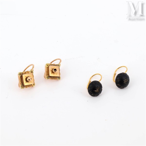 Deux paires de dormeuses en or jaune 18k (750 millièmes) à décor respectivement de losanges ciselés réhaussée d'une bille d'or (manques) et de boutons de jais ciselés.