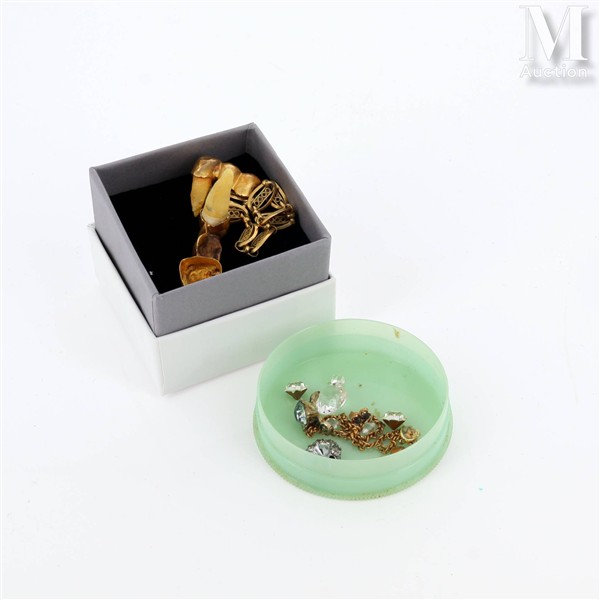 Lotto di detriti in oro giallo 18k (750 millesimi) tra cui un braccialetto rotto e oro dentale.
