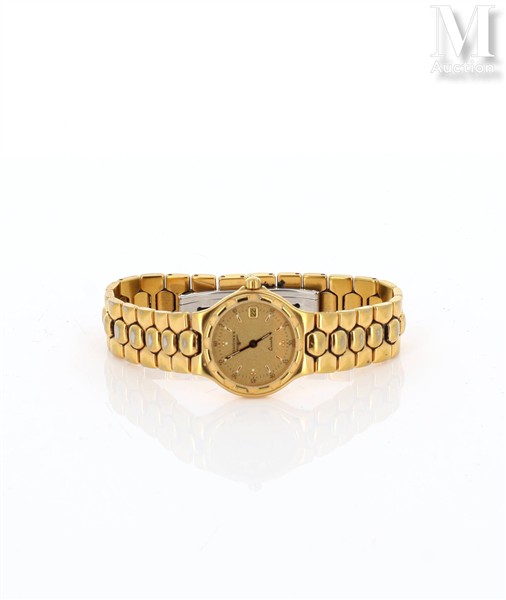 Montre de dame en métal doré et acier modèle Conquest. Cadran fond doré, index chiffres arabes et chemin de fer, guichet date à 3h, lunette à décor festonné en amati et brillant. Mouvement quartz.