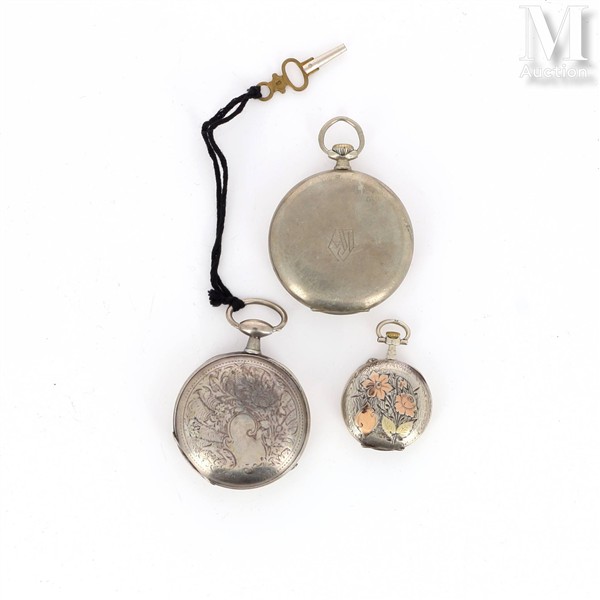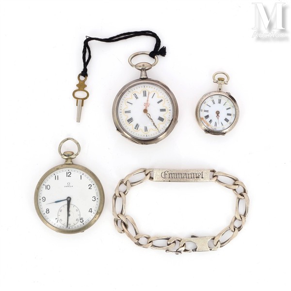 Lotto in argento (800 millesimi) comprendente un braccialetto identificativo inciso Emmanuel, un orologio da colletto e un orologio da tasca.