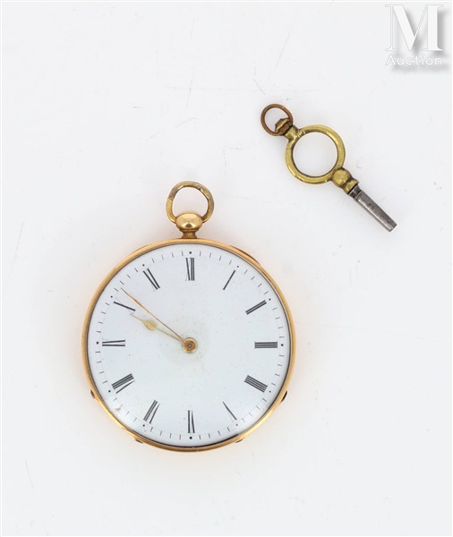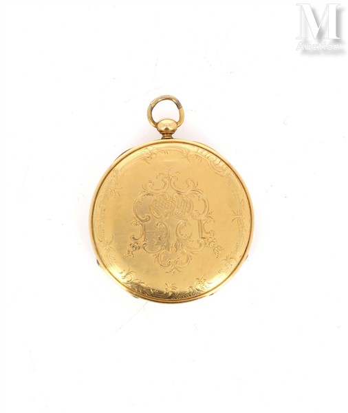 Montre de gousset en or jaune 18k (750 millièmes), cadran fond blanc, index chiffres romains et chemin de fer, verre plexi. Revers ciselé et guilloché. Double boîtier métal. Mouvement mécanique à remontage manuel par clé.