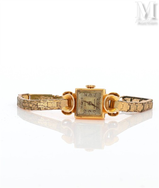 Montre de dame, cadran carré fond champagne signé SPIR, index chiffres arabes et chemin de fer, verre minéral, attaches en volutes. Boîtier carré en or jaune 18k (750 millièmes). Boîtier carré en or 18k (750 millièmes), fond clippé, numéroté 564. Mouvement mécanique à remontage manuel.