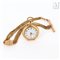 Montatura in oro giallo 18k (750 millesimi) comprensiva di catena per orologio in maglia da carcerato e orologio da colletto, quadrante bianco, numeri arabi e indici a punti, vetro plexi, movimento meccanico a carica manuale, retro con delicata decorazione di cartigli e avvolgimenti vegetali su fondo guilloché amati. Doppia cassa in oro 18k.