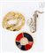 Set di tre spille, una modernista in metallo dorato martellato, un'altra raffigurante un sassofono in metallo argentato, l'altra di forma circolare smaltata in rosso e blu notte.