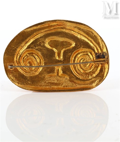 Broche en métal doré ovale à décor repoussé d'un visage anthropomorphe.