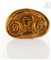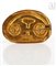 Spilla ovale in metallo dorato con decorazione in rilievo di un volto antropomorfo.