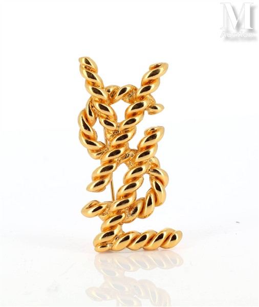 Broche en métal doré à décor du monogramme YSL, les lettres formées d'un cordage.