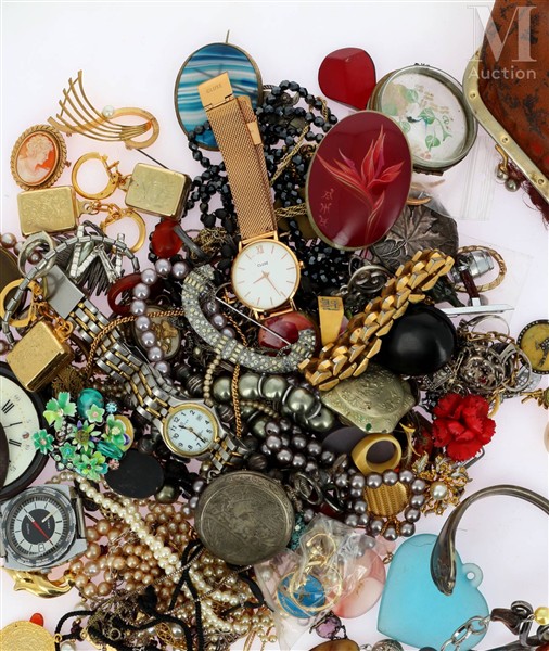 Important lot de bijoux fantaisie comprenant colliers, montres, bagues, broches, pendentifs, etc...