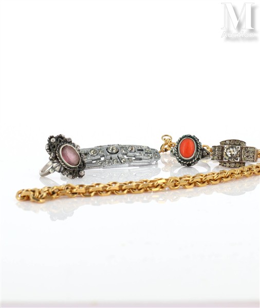 Lot comprenant trois bagues en argent (800 millièmes) serties respectivement de pierres blanches d'imitation, d'un cabochon de corail et d'une améthyste; une broche en métal argenté sertie de pierres blanches d'imitation et une chaîne de cou en métal doré.