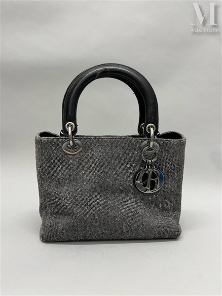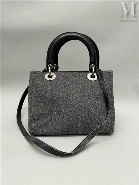 Sac "Lady Dior" en tweed gris chiné et cuir noir. Bijouterie et garniture en métal argenté. Bandoulière amovible.