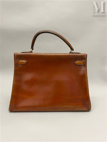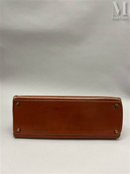 HERMÈS Sac Kelly 32 en veau box gold. Garniture et bijouterie en métal doré....