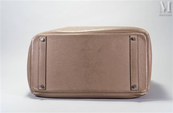 Borsa Birkin 40cm ritornata in vitello togo tortora. Fodera in capretto color tortora. Gioielli in metallo palladio.