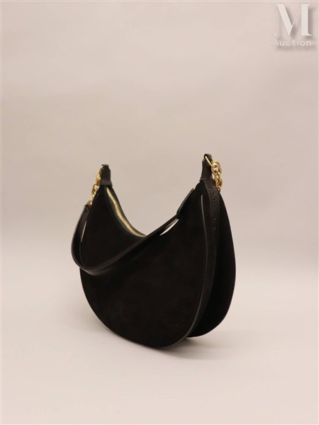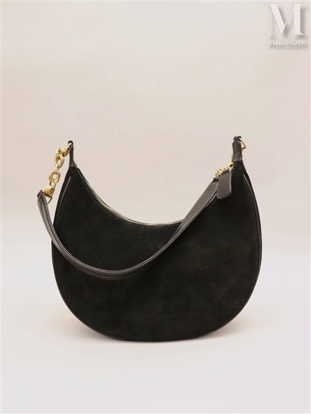 Sac demi-lune en cuir effet daim noir, chaînette en métal doré, porté épaule.