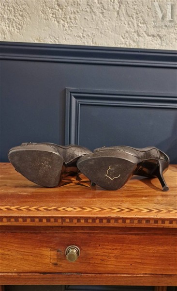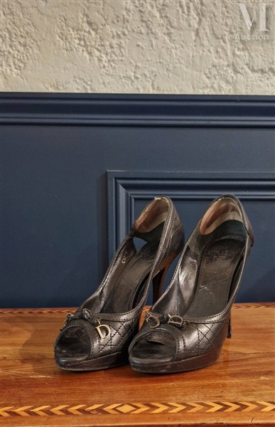 Escarpins en cuir surpiqué noir, breloques "CD" à l'avant de la pièce. Talons 12cm. Patin 2cm. Ressemelées
