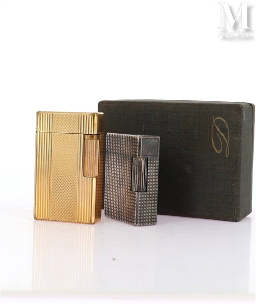 Due accendini DUPONT, rispettivamente in metallo dorato decorato con gadroons e semi di chicchi d'orzo; e argento con decorazione a punta di diamante.
