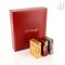 Tre accendini rispettivamente in metallo placcato oro, argento e lacca cinese rossa.