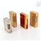 Quattro accendini DUPONT rispettivamente in oro placcato decorati con punte e scanalature di diamante; in metallo argentato con decoro a punta di diamante; e in lacca con intarsio metallico che imita la marmorizzazione.