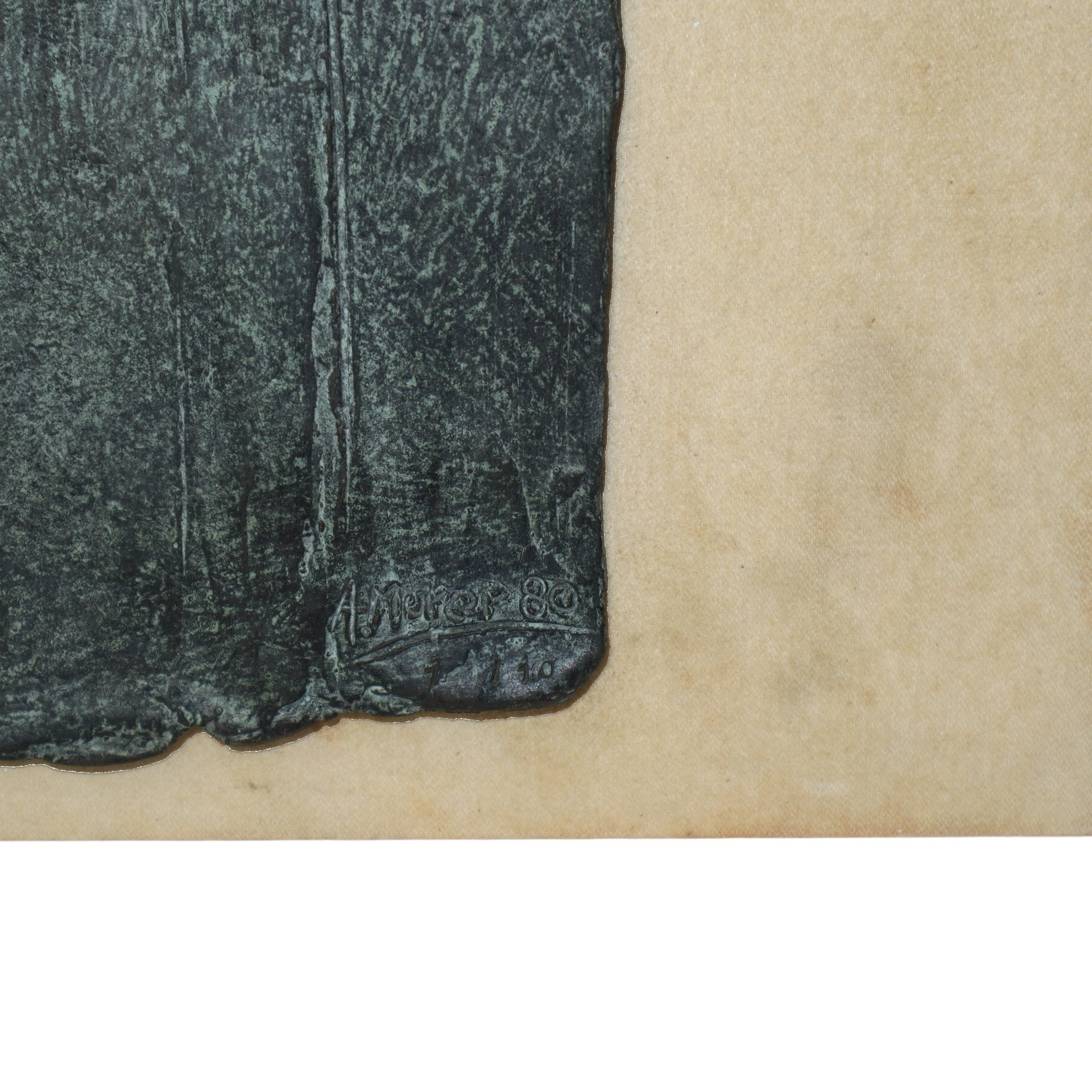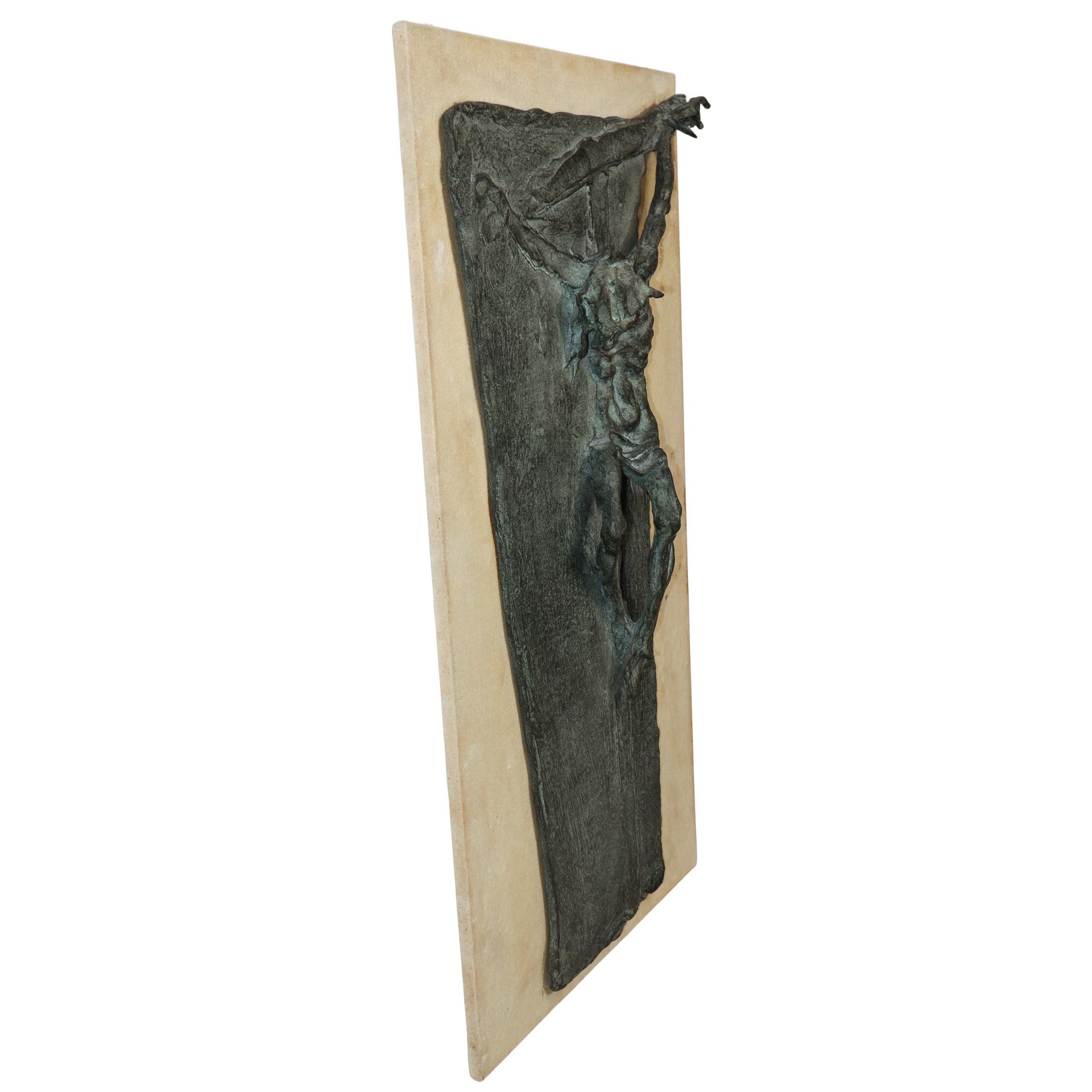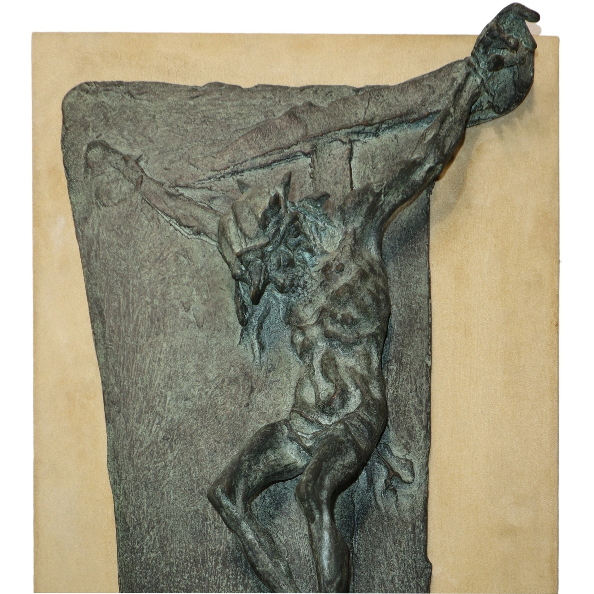Franco Murer (Piè Falcade 1952) - Crocifissione, 1980 cm 71x20x2  Scultura in bronzo patinata verde applicata a un supporto. Firmato e datato in basso a destra. Scultura in bronzo patinata verde applicata a un supporto. Firmato e datato in basso a destra.