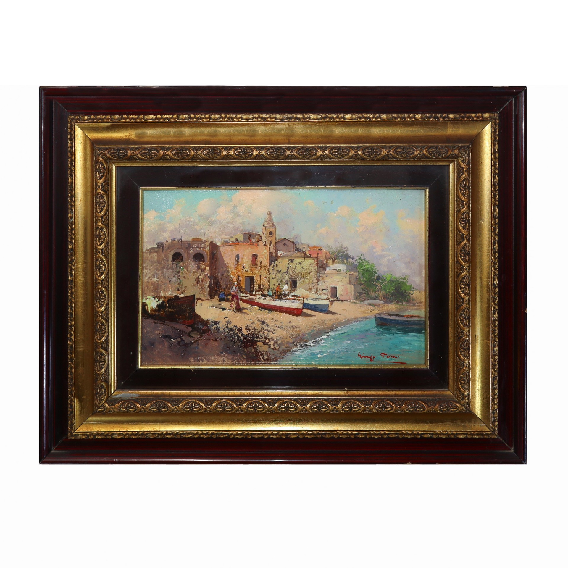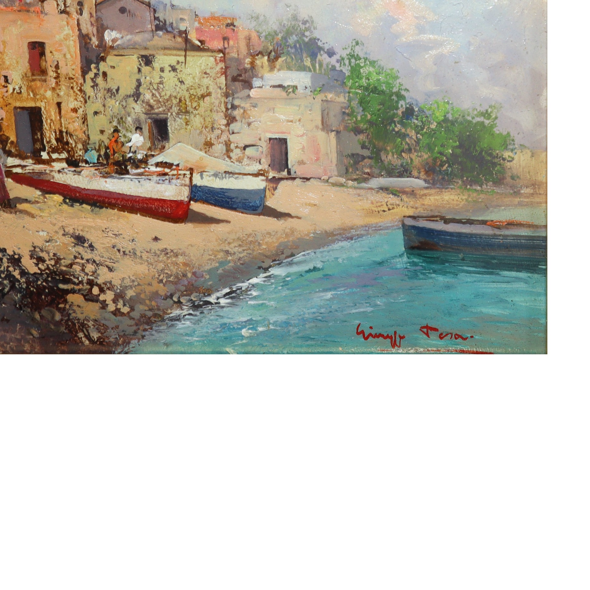 Giuseppe Tesa (XX Sec.) - Marina con barche 18 x 28 in cornice 36 x 47 Olio su tavoletta Firmato al fronte in basso a destra.