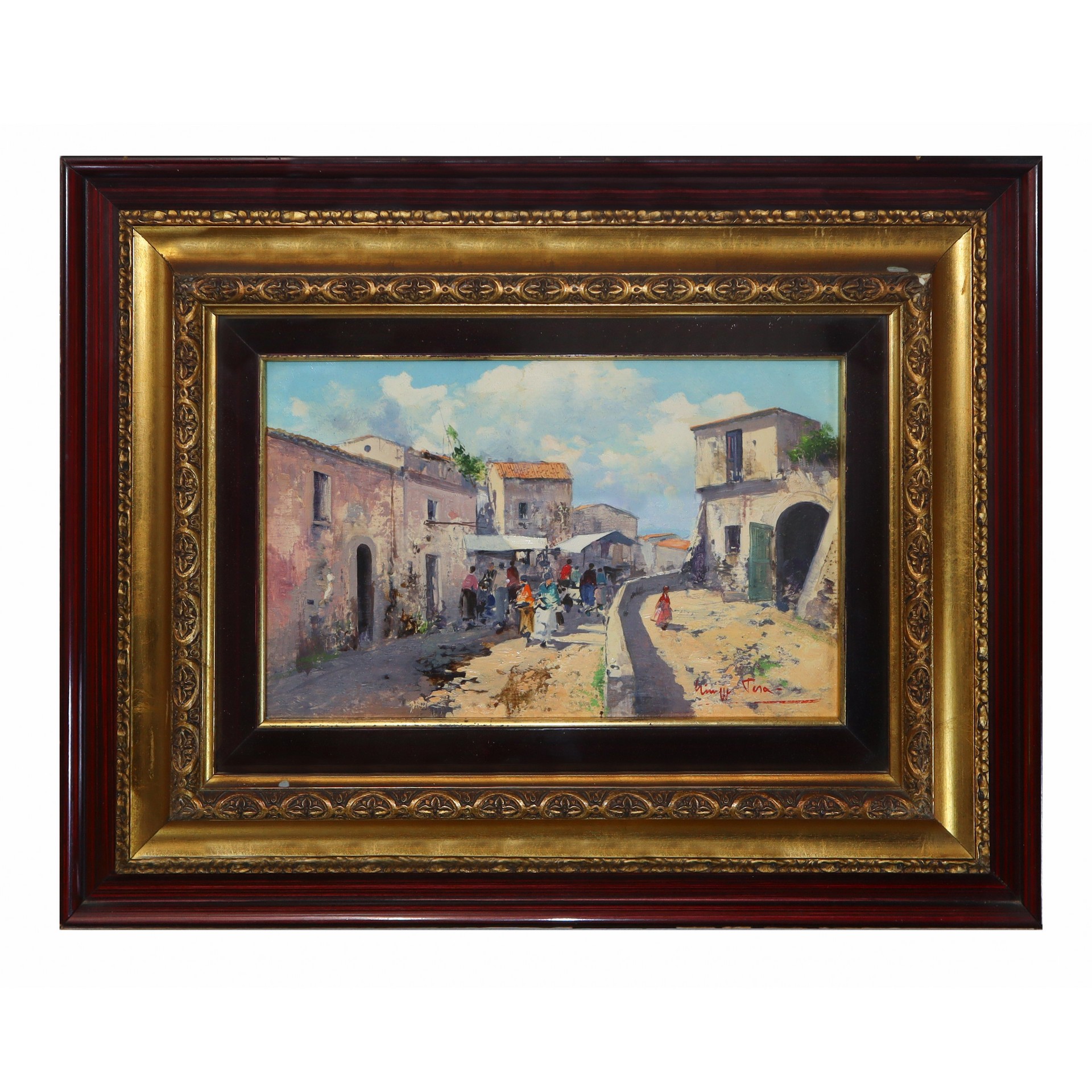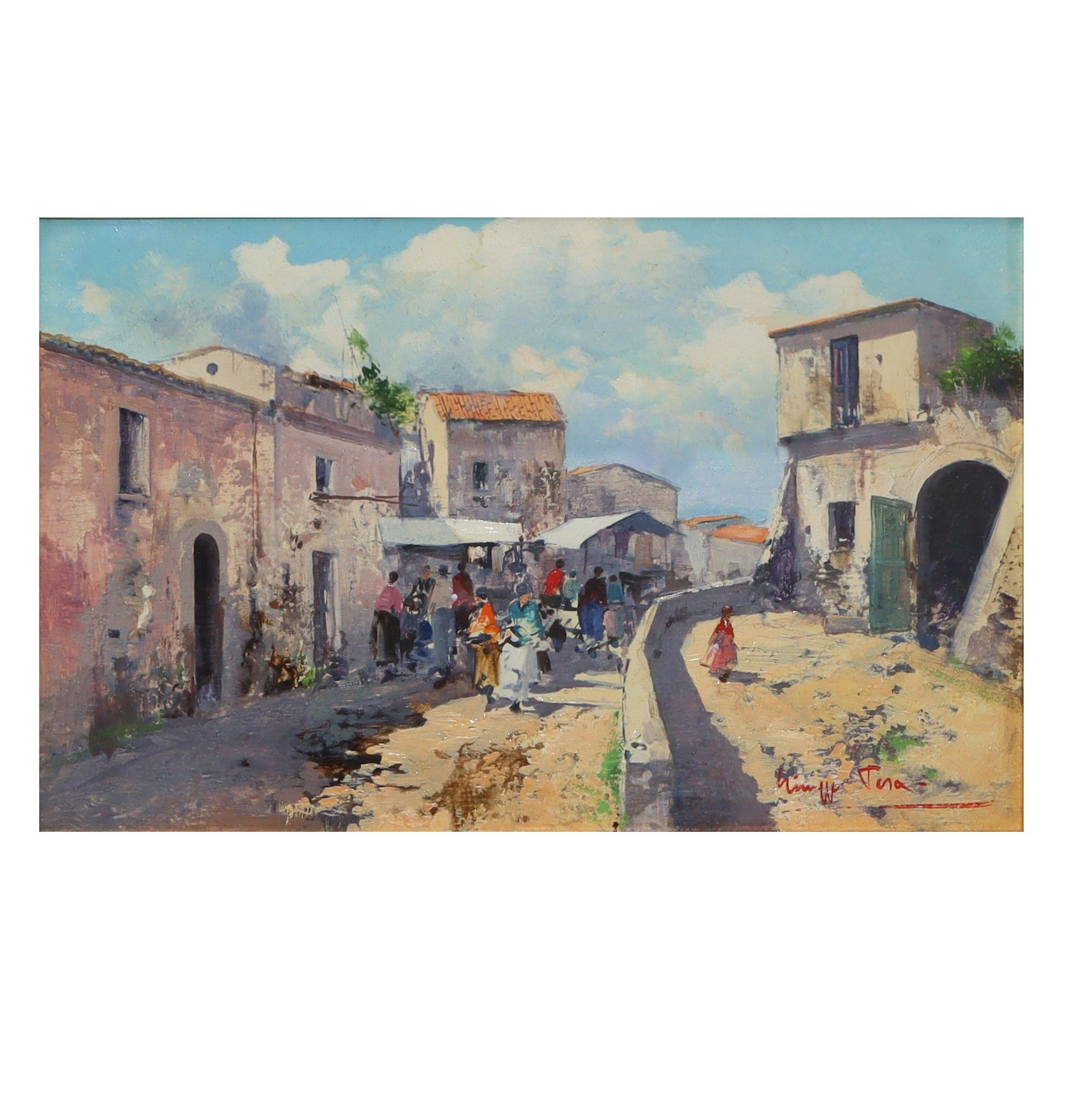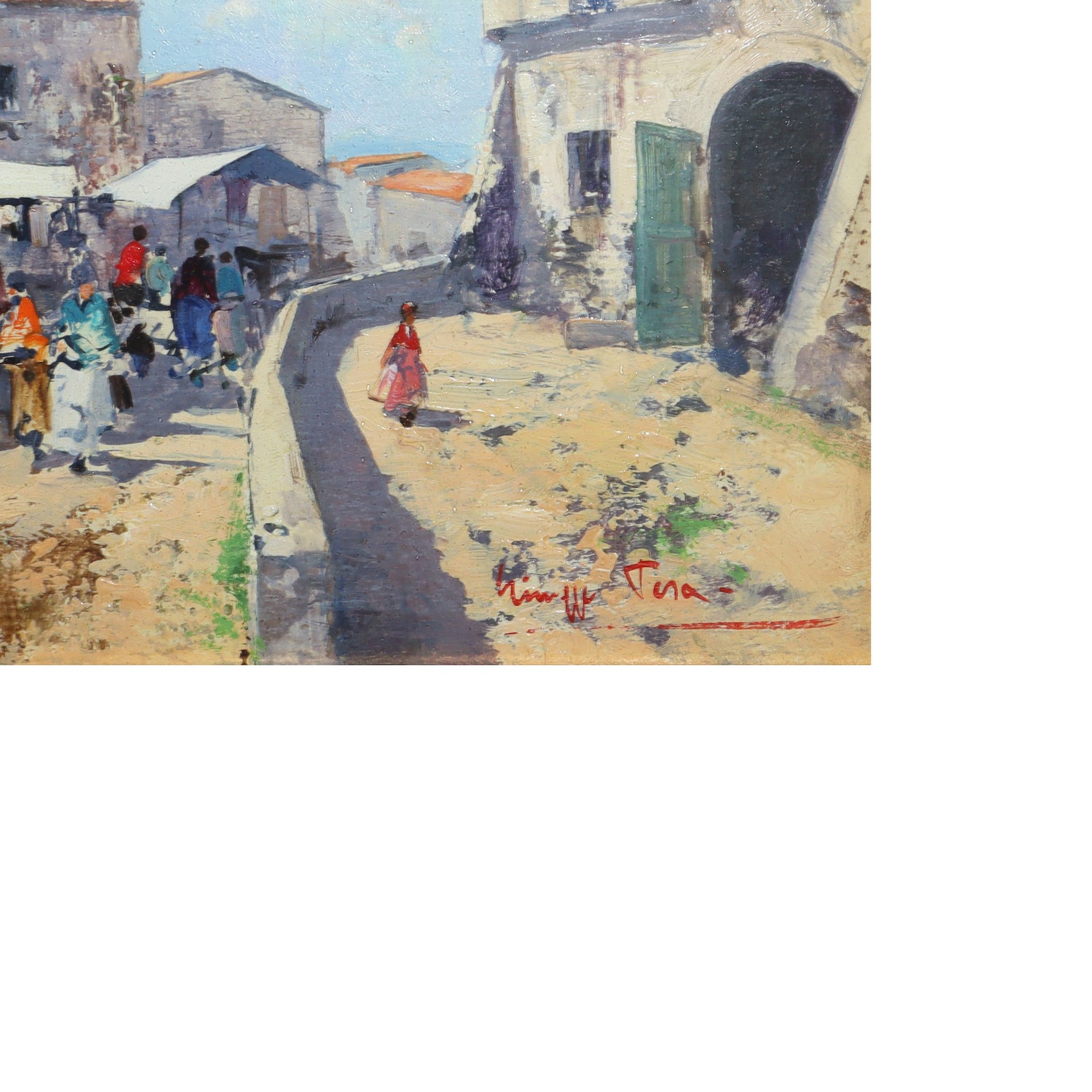Giuseppe Tesa (XX Sec.) - Gente al mercato 18 x 28 in cornice 36 x 47 Olio su tavoletta Firmato al fronte in basso a destra.
