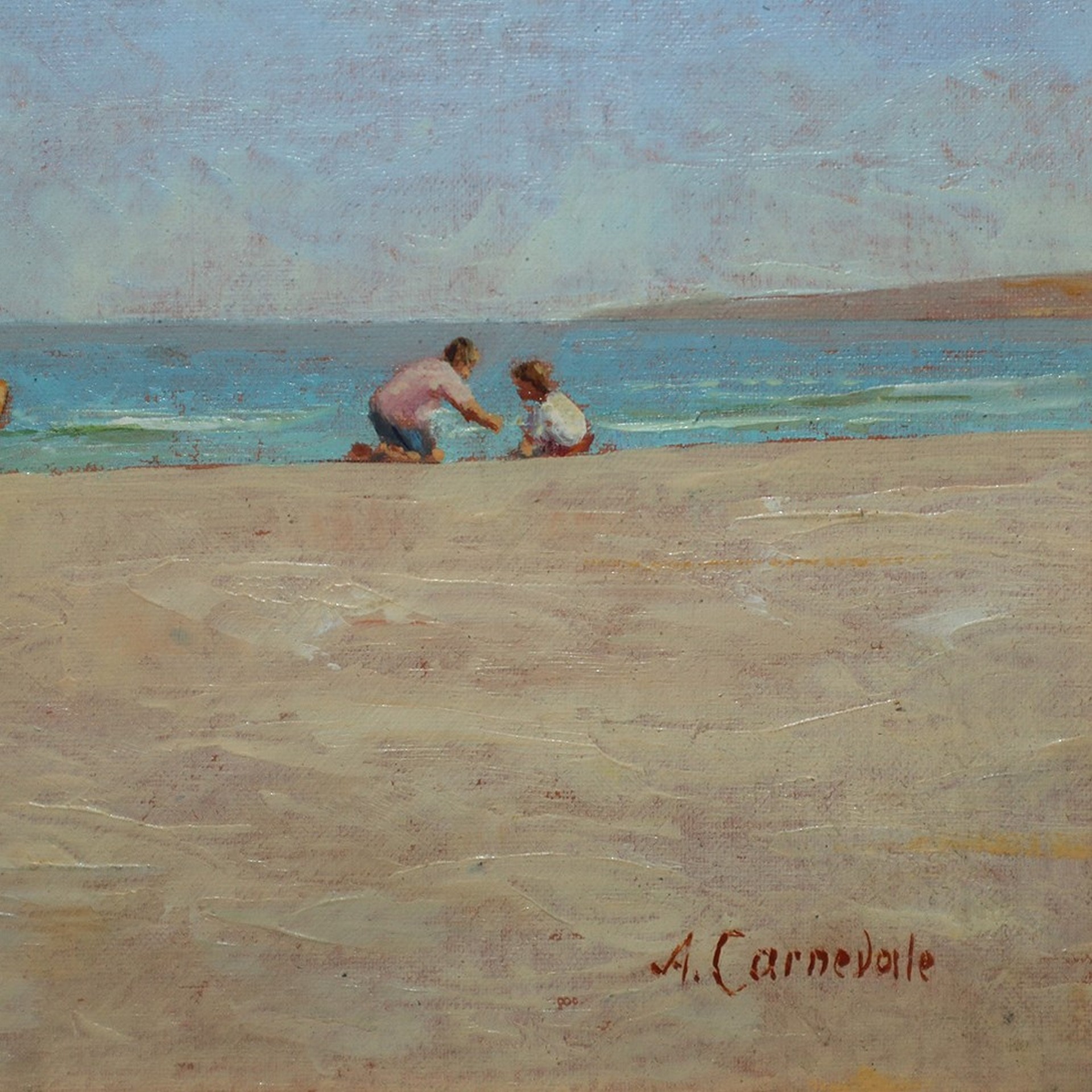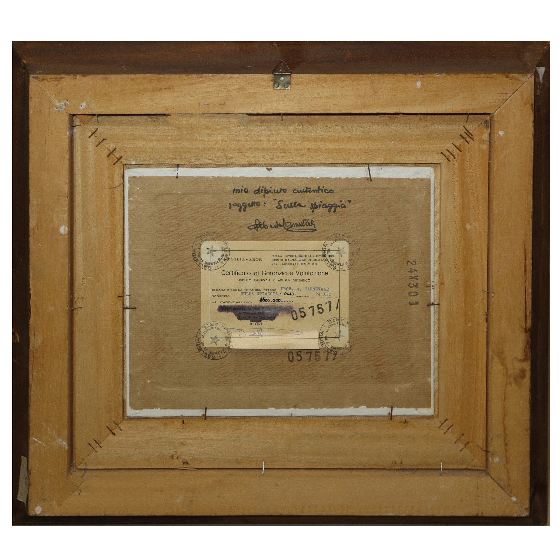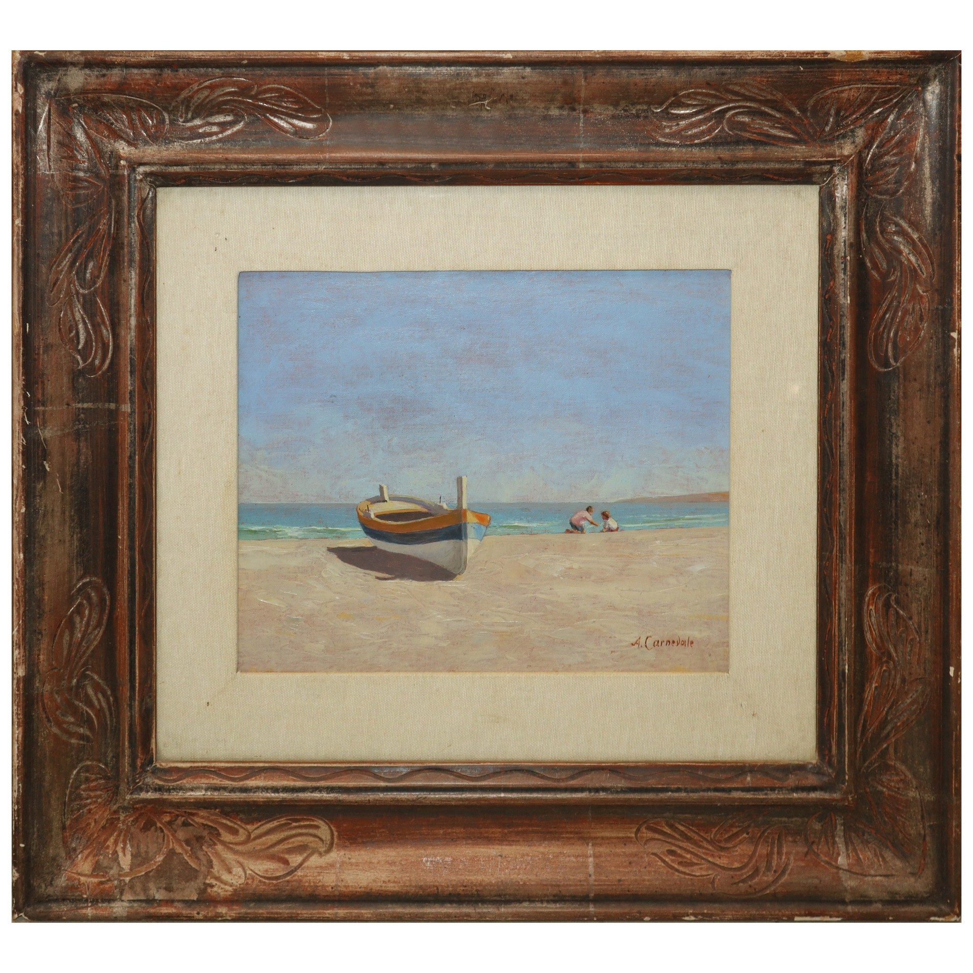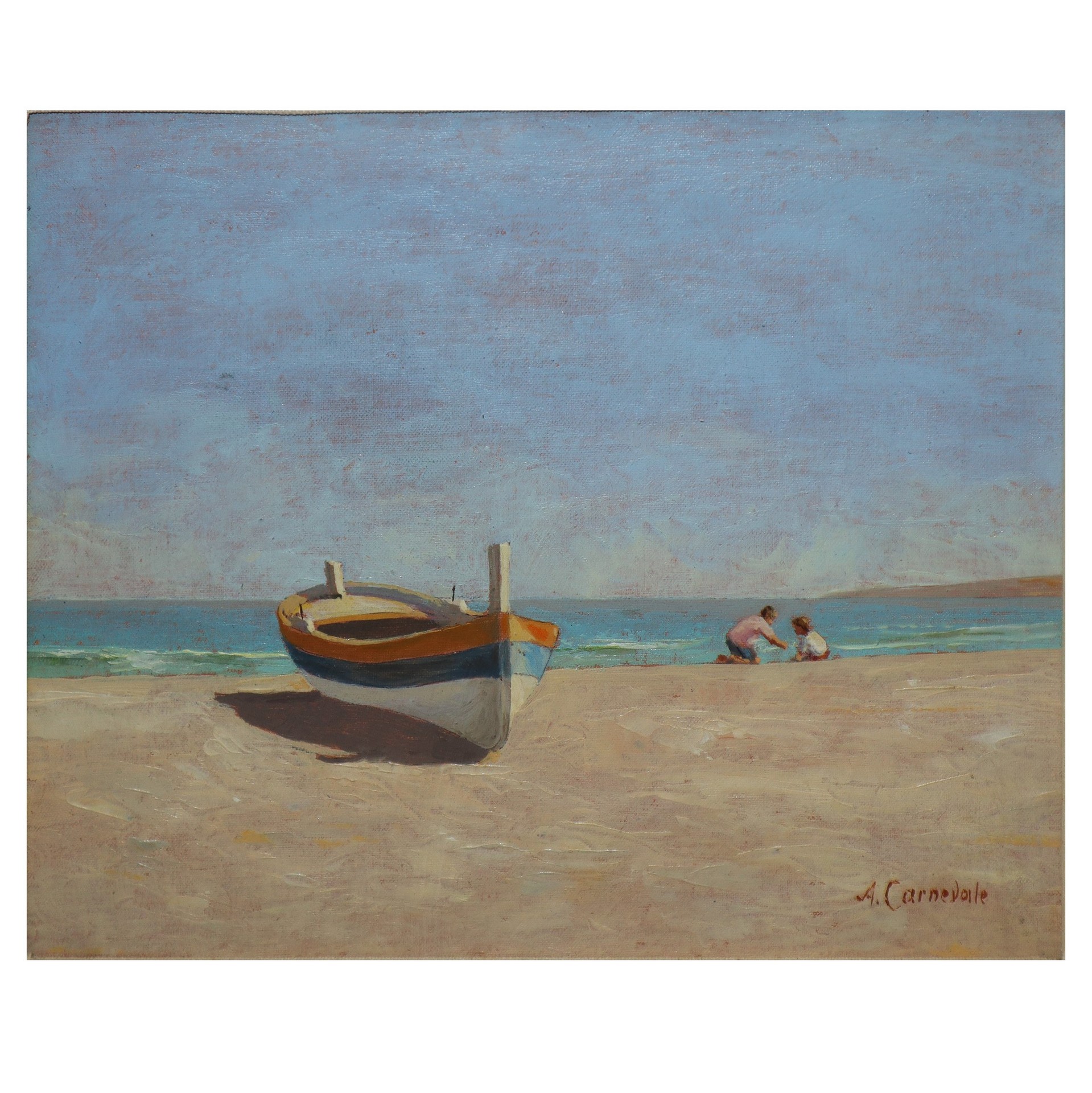 Alberto Carnevale (Roma 1931) - Sulla spiaggia 24x30 in cornice cm 48,5x55 Olio su cartone telato Firmato in basso a sinistra . Titolato, datato e autenticato al retro. Sul retro certificato di Garanzia e valutazione.