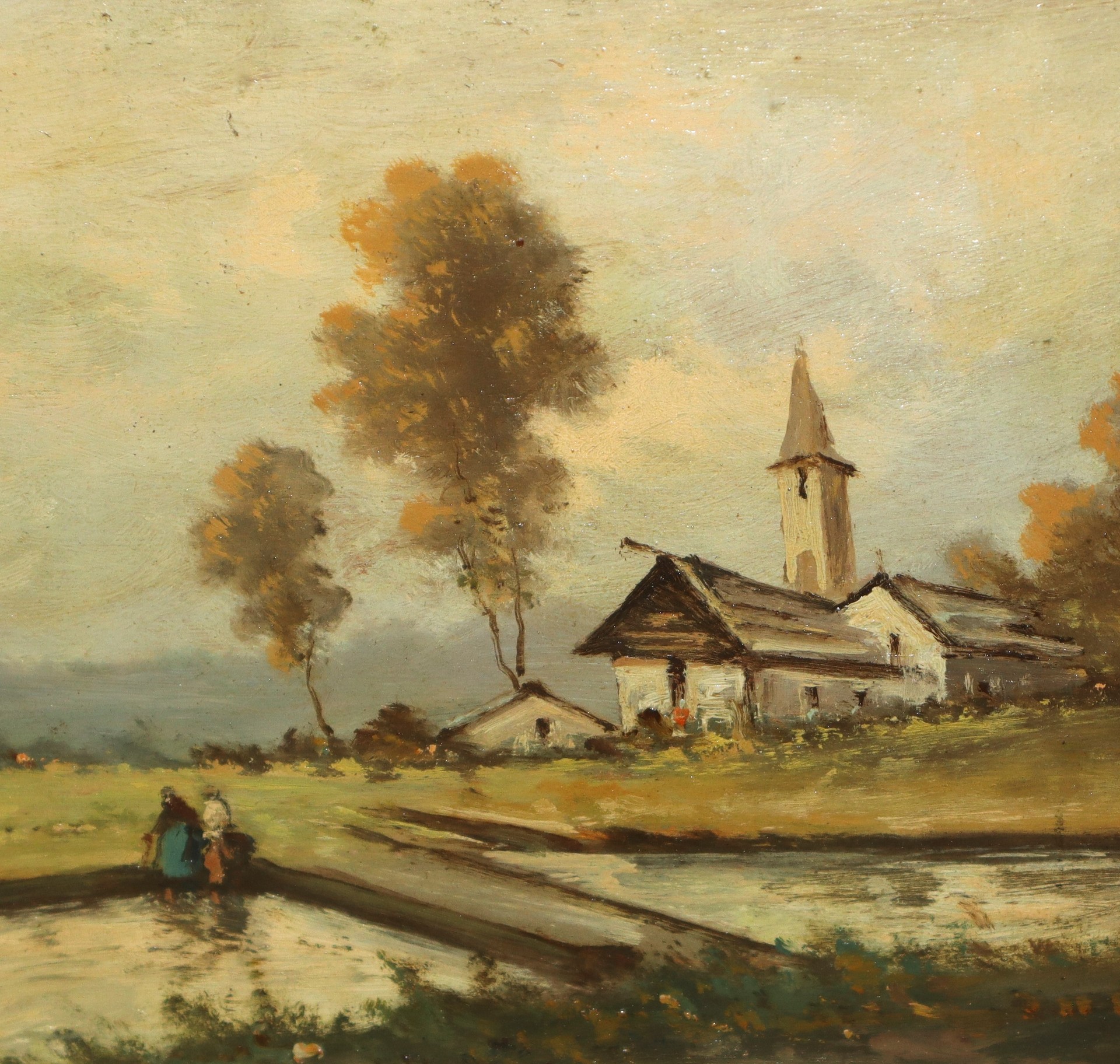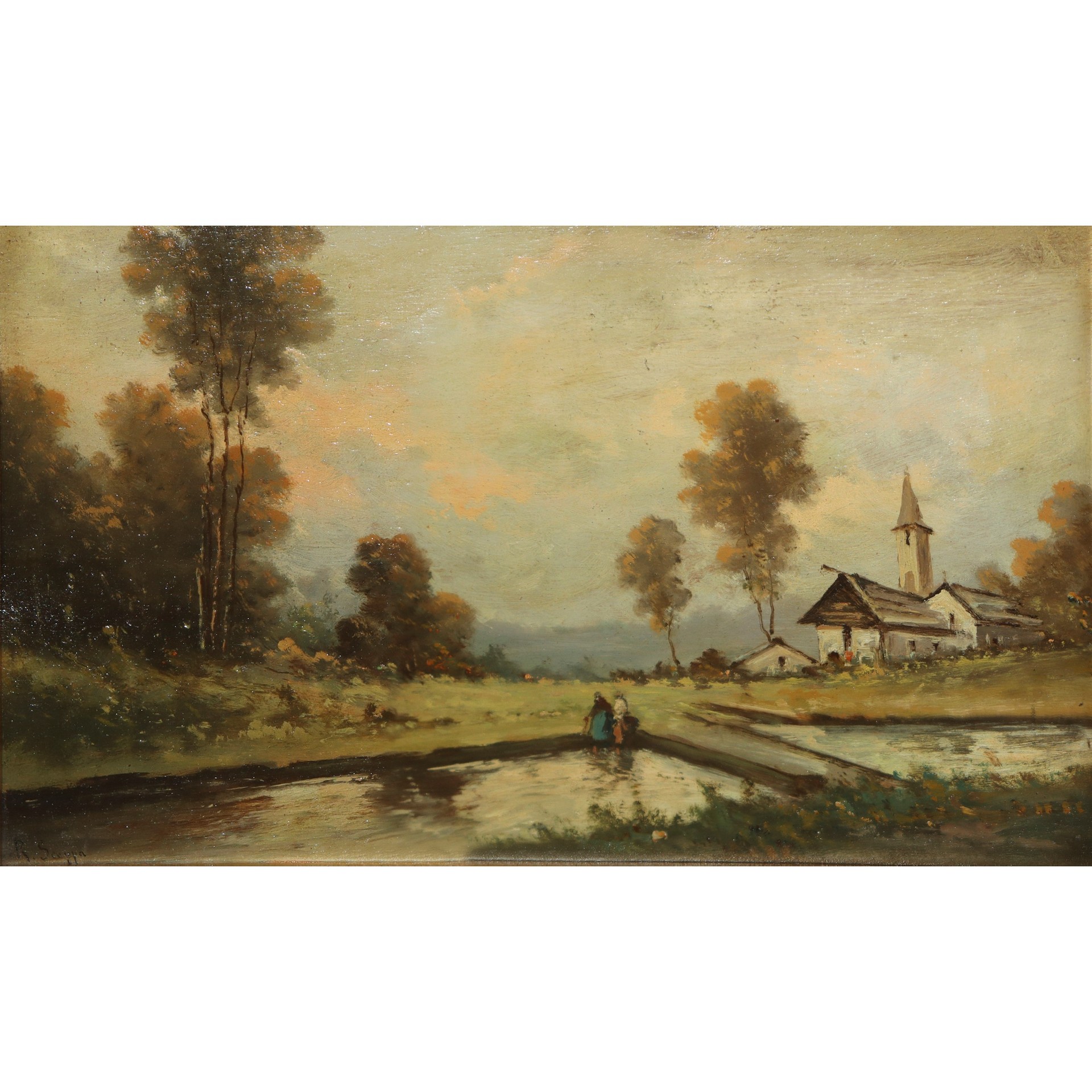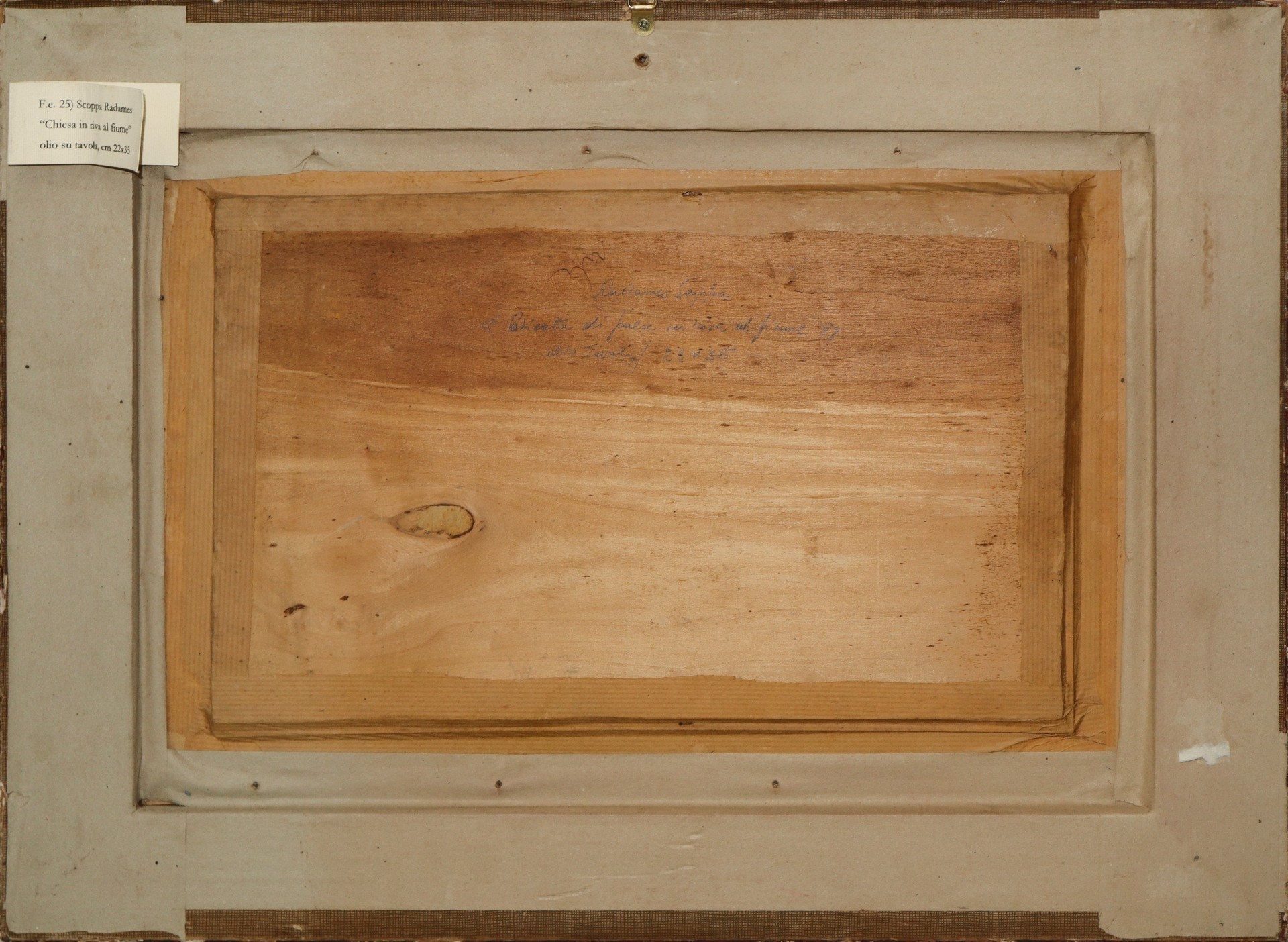 Radames Scoppa (Napoli 1820) - Chiesa in riva al fiume H cm 22 x 35, (in cornice) cm 40 x 53 Olio su tavola Firmato sul fronte in basso a sinistra. Etichetta descrittiva, firma, titolo, tecnica e misura al retro.