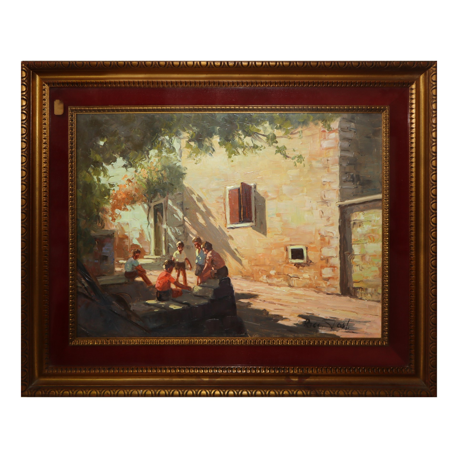 Riccardo Tosti (Trieste 1910 - 1986) - Cortile rustico con figure 50 x 70 cm in cornice 72 x 95 cm Olio su tela