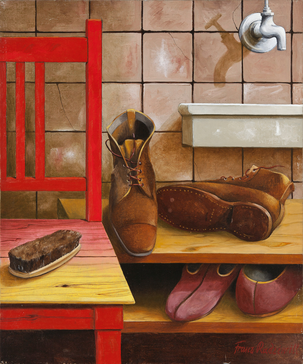Franz Radziwill Strohausen 1895 – Wilhelmshaven 1983 Natura morta con scarpe 1967 Olio su tavola, 55,5x46 cm Firmato in basso a destra Franz Radzwill Al retro: numero 591; etichetta della galleria Il Fante di Spade, Roma; etichetta della galleria Mutina, Modena; timbro della galleria Del Levante, Milano Provenienza: collezione privata, Lodi Esposizioni: Roma, Galleria Il Fante di Spade; Modena, Galleria La Mutina, 1969