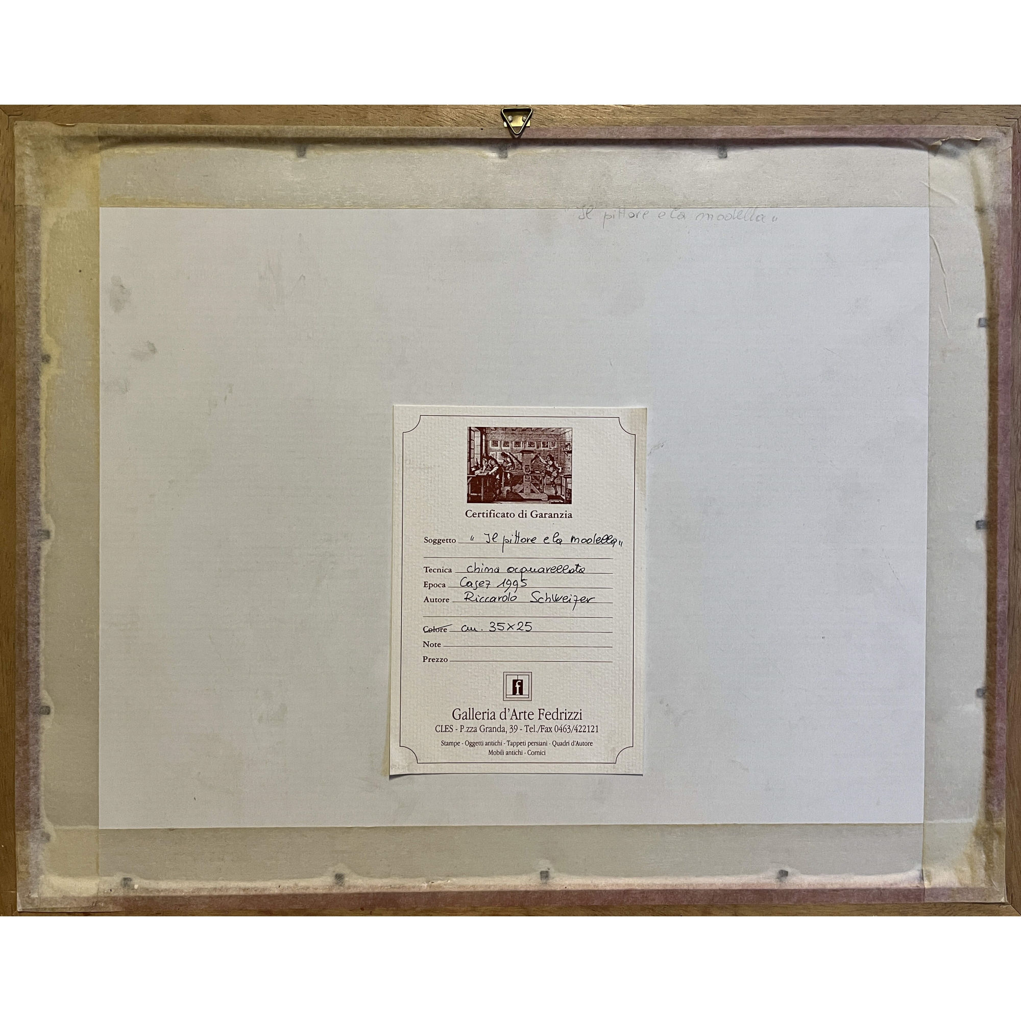 Riccardo Schweizer (1995), Il pittore e la modella, china aquerellata, cm 25x35. Firmato in basso a dx.
