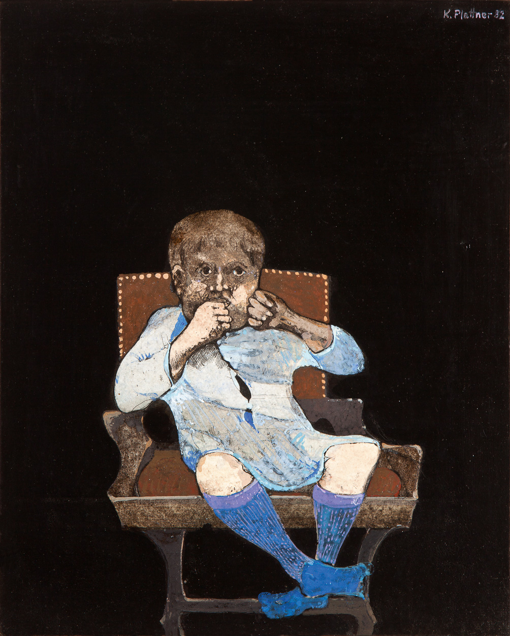 Karl Plattner Malles Venosta 1919 – Milano/Mailand 1986 Bambino sulla seggiola, 1982 Olio su tavola, 29,8x24 cm Firmato e datato in alto a destra: K. Plattner 82