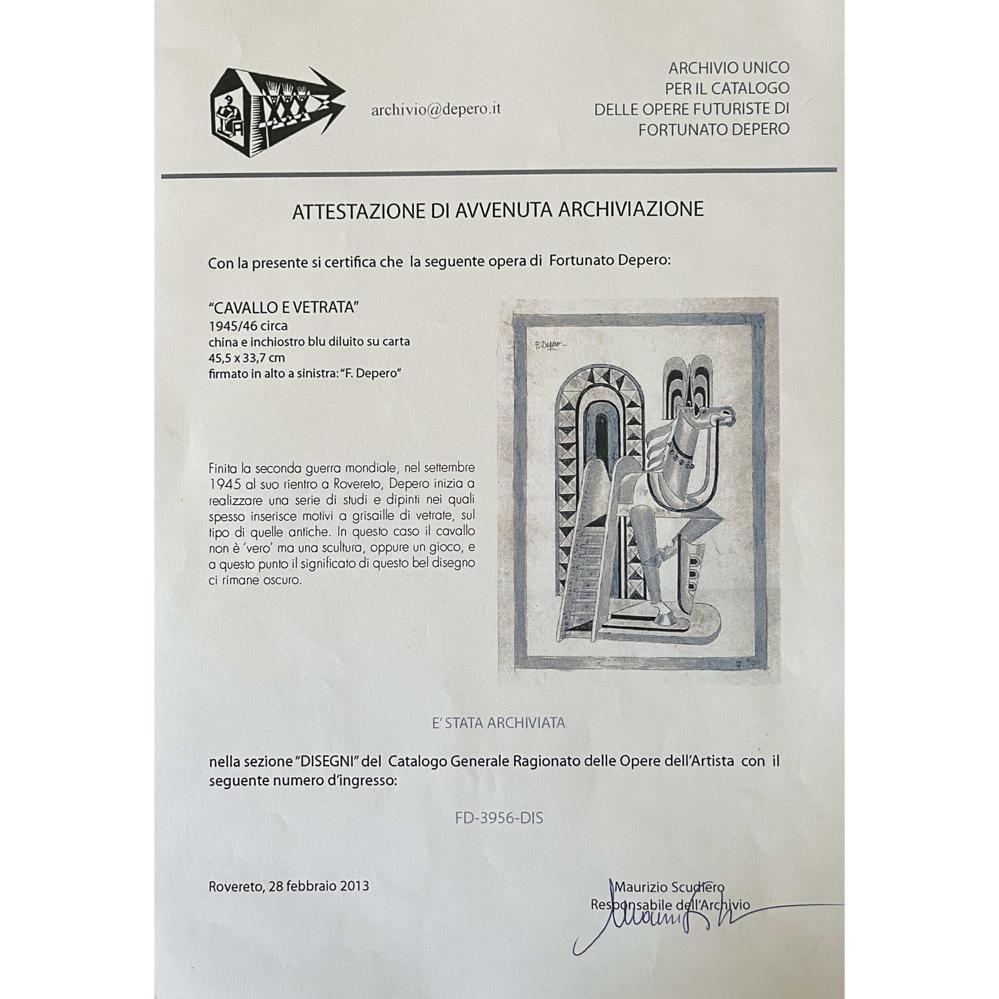 Fortunato Depero (1945/46 circa), Cavallo e Vetrata, china e inchiostro blu diluito su carta, cm 45,5x33,7. Non in cornice. Firmato in alto a sx. L'opera è corredata di autentica (2013) di Maurizio Scudiero. Archiviata nella sez. "Disegni" del Catalogo Generale Ragionato delle Opere dell' Artista.
