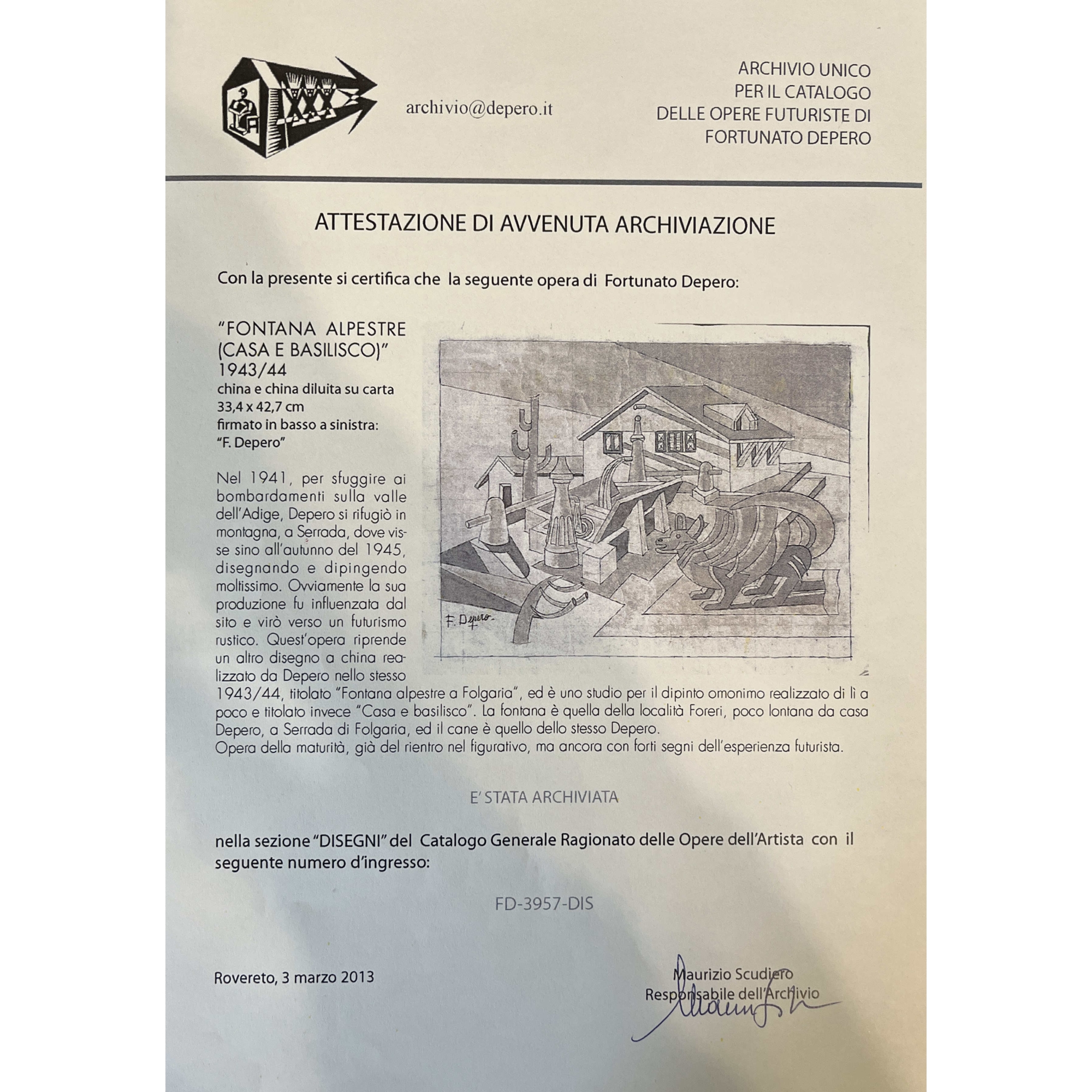 Fortunato Depero (1943/44), Fontana Alpestre (Case e Basilisco), china e china diluita su carta, cm 33,4x42,7. Non in cornice. Firmato in basso a sx. L'opera è corredata di autentica (2013) di Maurizio Scudiero. Archiviata nella sez. "Disegni" del Catalogo Generale Ragionato delle Opere dell' Artista. Prezzo di riserva.