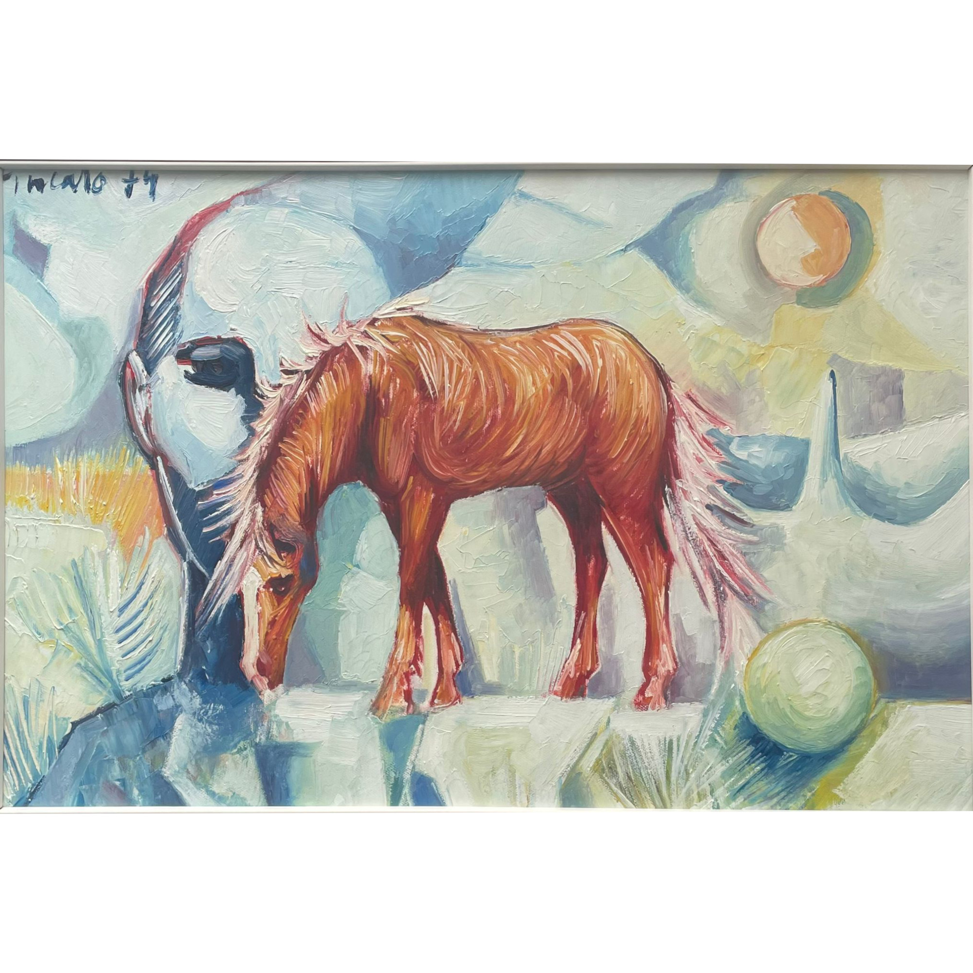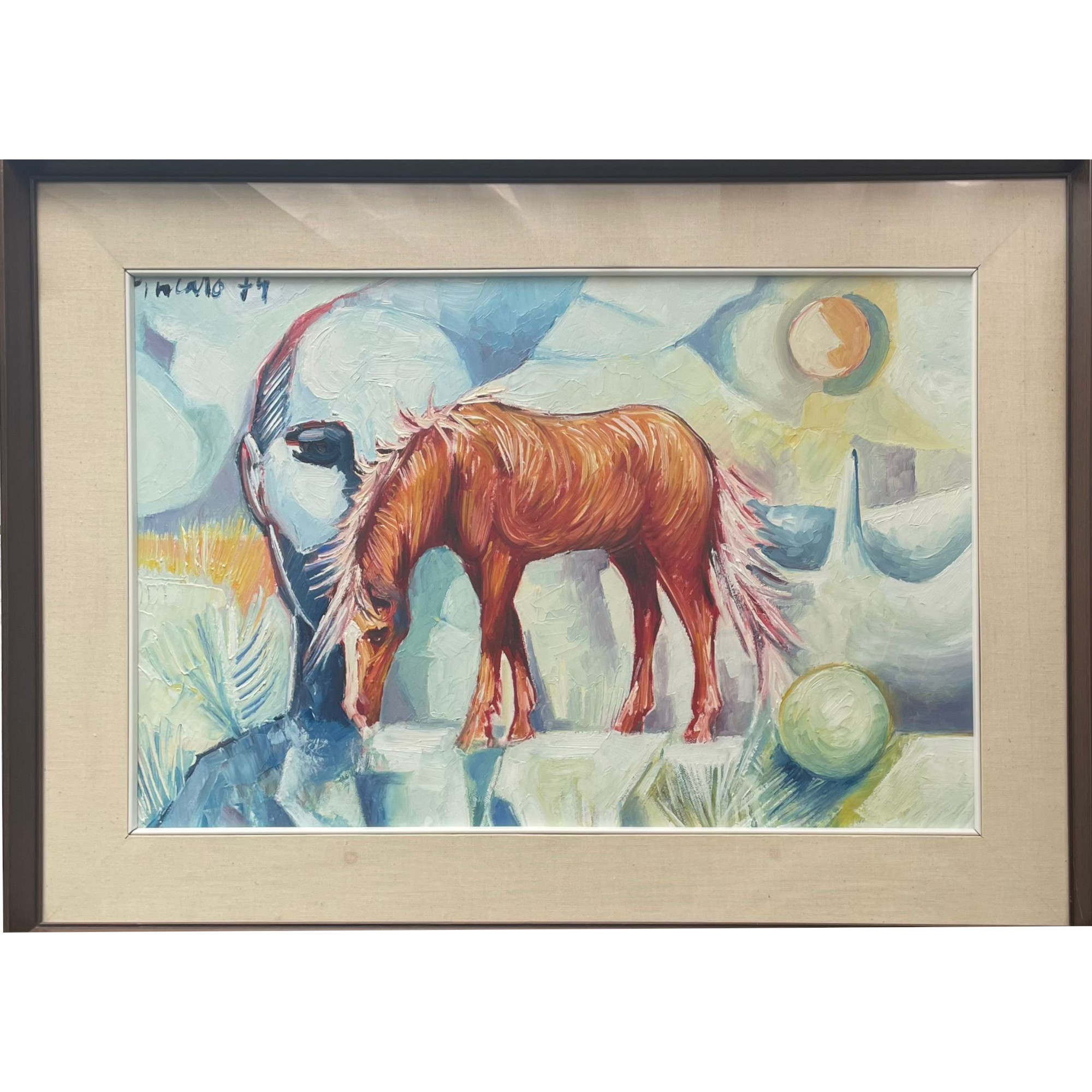Fincato (1974), senza titolo. Tecnica mista su tela. Probabilmente si tratta di Mario Fincato, artista di Fiera di Primiero scomparso nel 1982 a poco più di 40 anni. Ha esposto a Parigi, Venezia e New York. In cornice cm 54x74. Firmato in alto a sx.