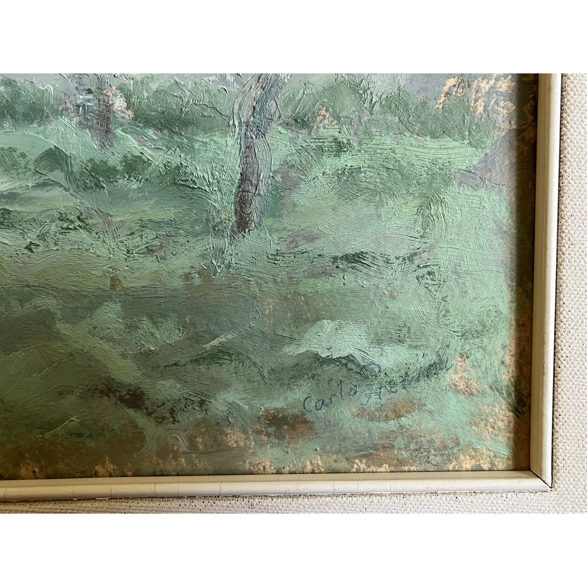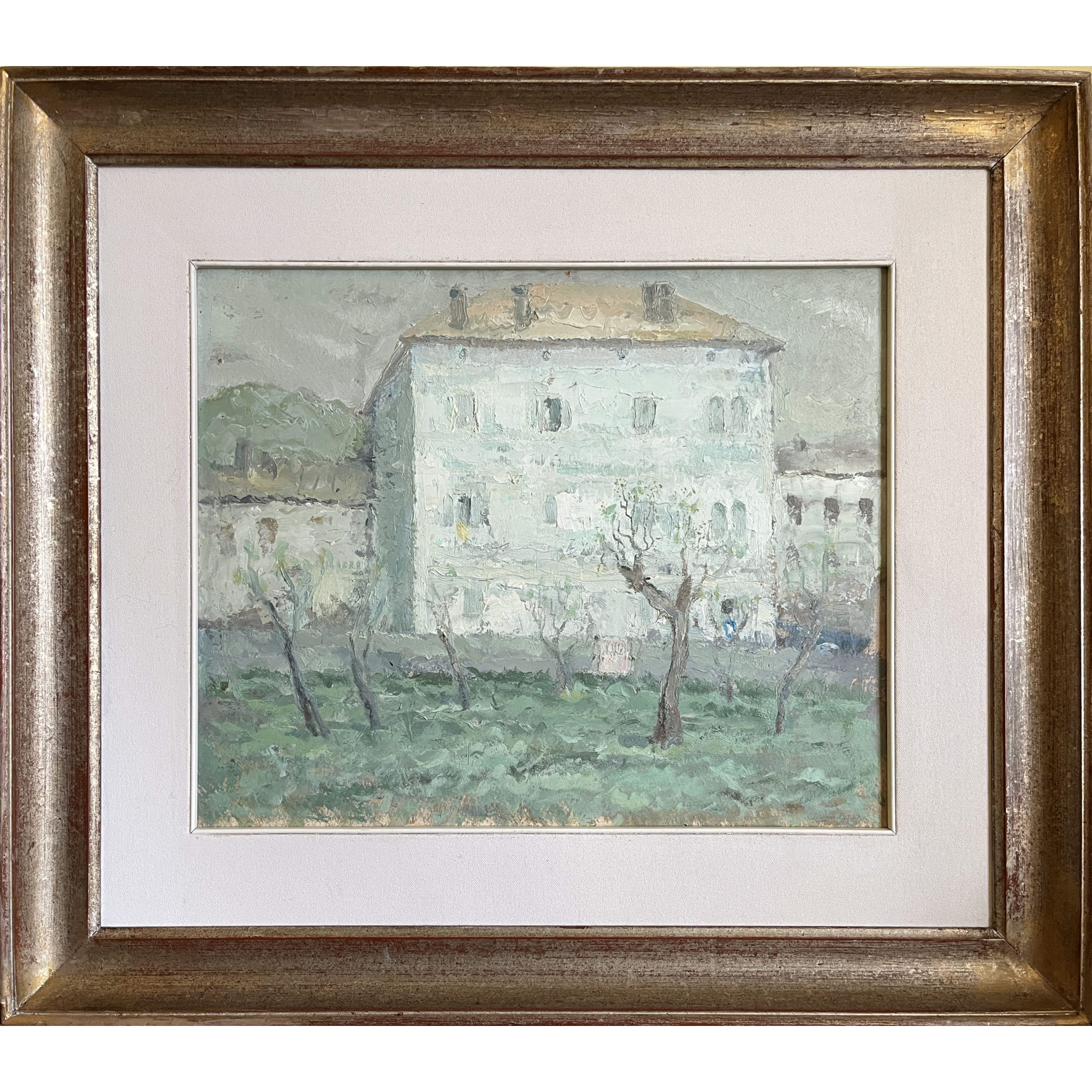 Carlo Pizzini (anni '30), Case a Riva del Garda, olio su cartone, cm 39x48, in cornice cm 62x72. Firmato in basso a dx