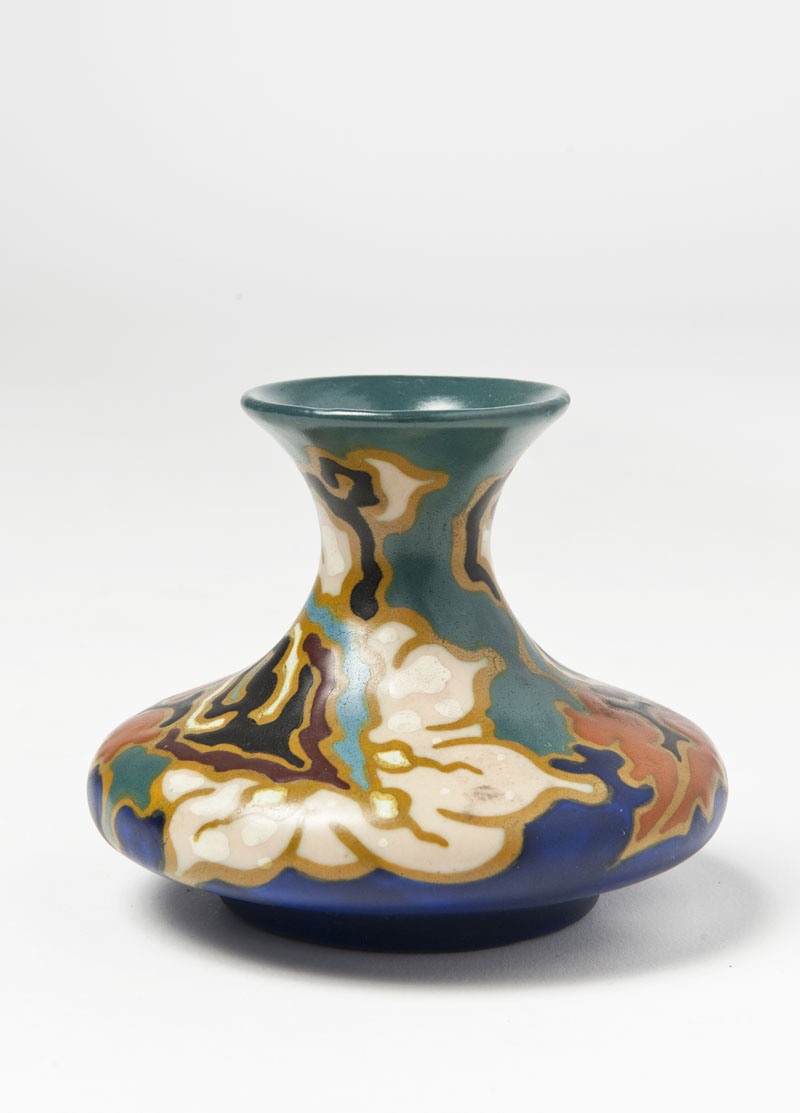 Manifattura Regina, piccolo vaso in ceramica decorata con smalti policromi modello "Tagora". Gouda, Olanda, anni 20 del sec XX. Marcata in bruno sotto la base con il monogramma della corona e la scritta "REGINA WB 474 TAGORA GOUDA HOLLAND" (h cm 8,5) (difetti)