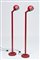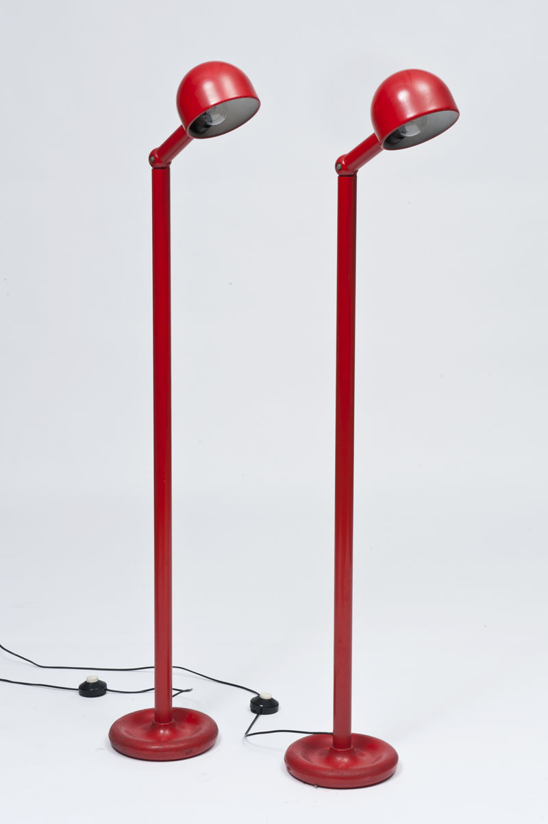 Coppia di lampade da terra in ghisa e metallo laccato rosso. Porta lampade reclinabile in metallo laccato rosso. Produzione Stilnovo, Italia anni 70 del sec XX