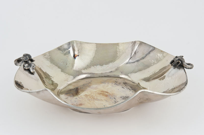Lotto 23 | Centrotavola biansato in argento a bordo sagomato e martellinato, anse...