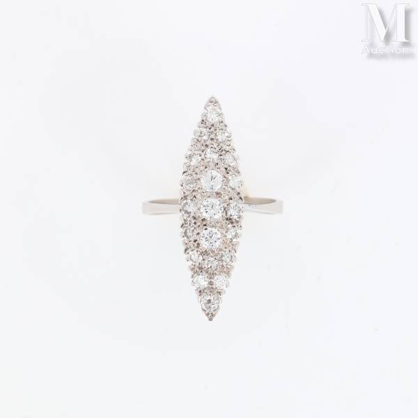 Bague marquise en or blanc 18k (750 millièmes) sertie de diamants ronds taille brillante et 8x8. Le diamant central d'environ 0,1 carat.