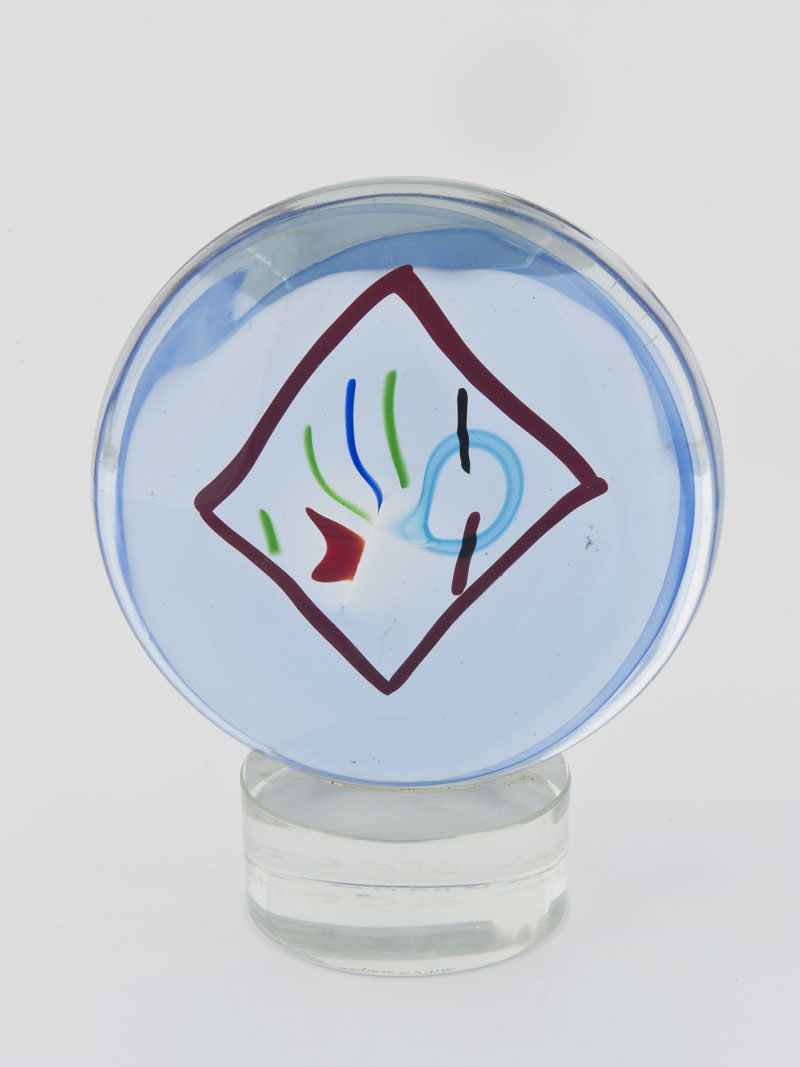 P. Stolz - Seguso - Scultura a soggetto geometrico astratto in vetro sommerso policromo di forma ovoidale. Montata su basamento in vetro firmato e numerato a punta “P. Stolz - Seguso Vetri d’Arte - Murano 1972 - 1/1” (h cm 24)