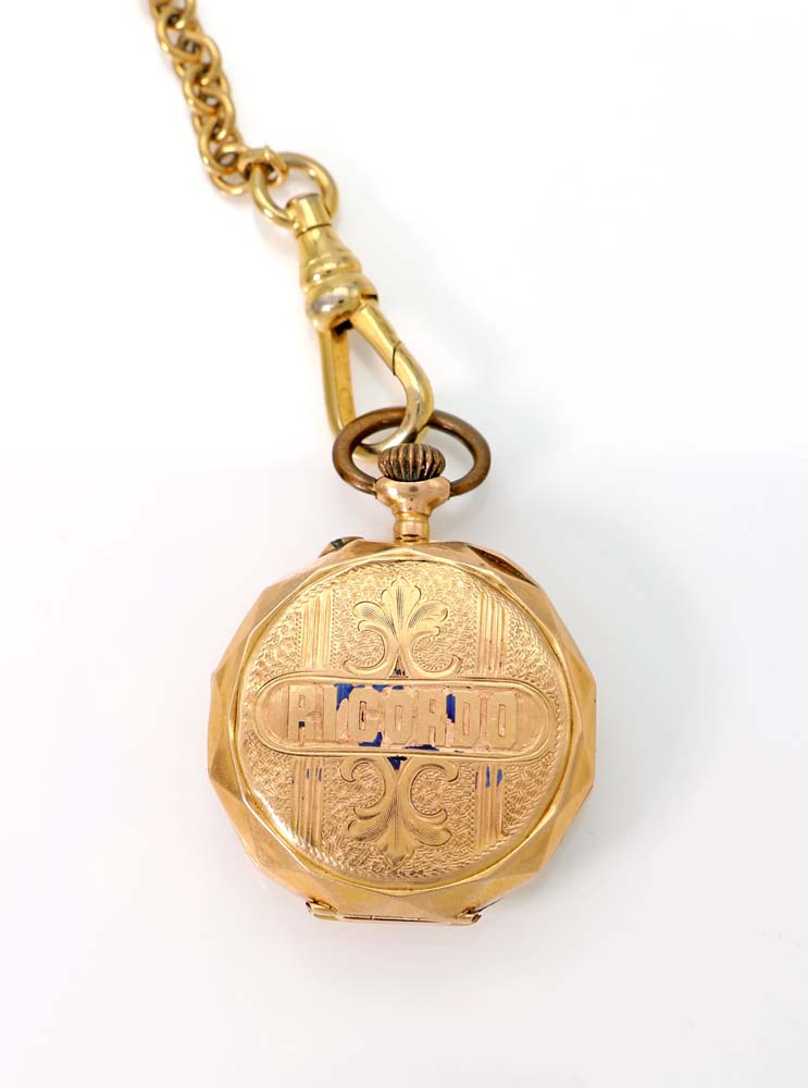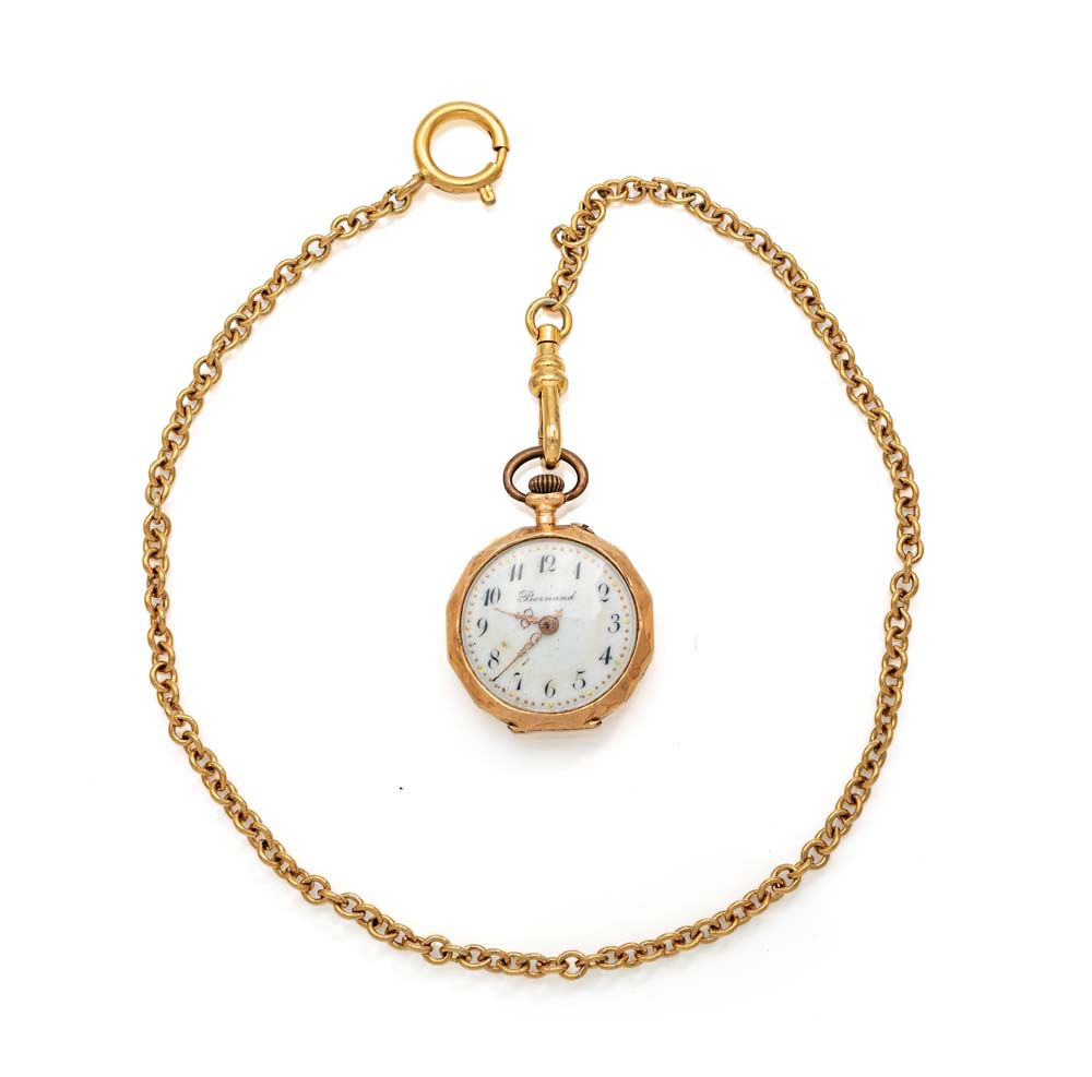 Bornard - Orologio da tasca in oro con catena in metallo dorato Diametro mm. 25 1900 Oro giallo 750/000. Cuvette in metallo dorato. Fondello inciso a volute con scritta ricordo. Quadrante in smalto bianco, numeri arabi. Movimento con carica a remontoire, scappamento a cilindro. Catena in metallo dorato.