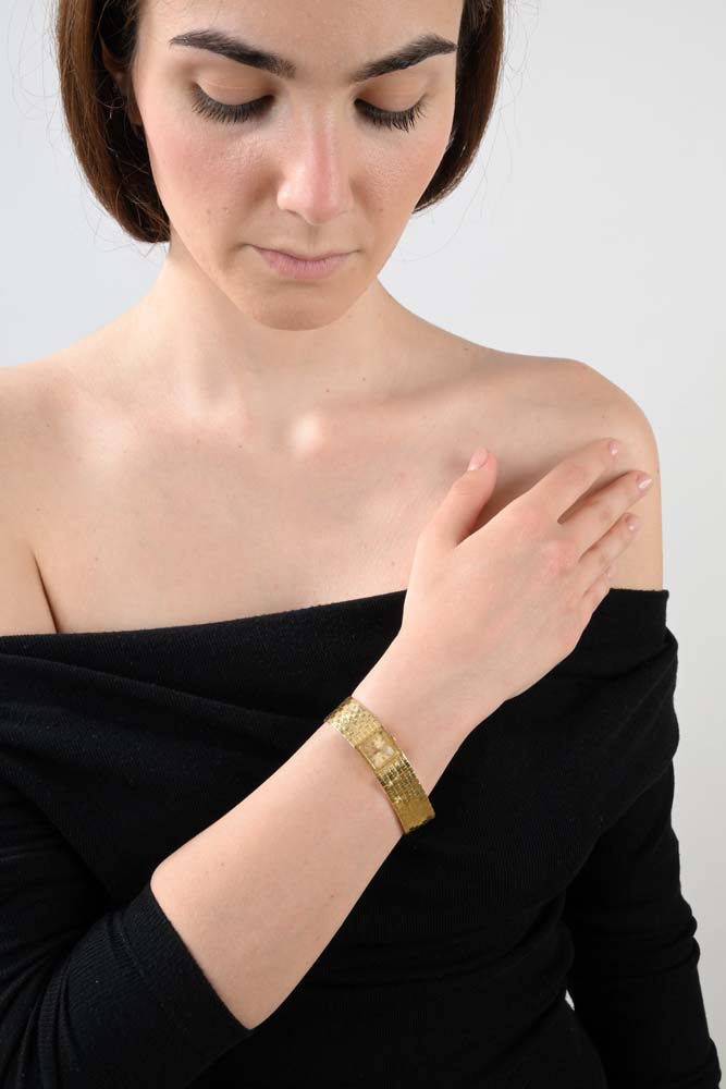 Rolex Precision - Orologio da polso da donna a fibbia in oro Cassa mm. 15 x 21. Lunghezza cm 15/18 Anni '50 Oro giallo 750/000. Ref. n° 8209. Cassa n° 312603, fondello a scatto. Bracciale incorporato in oro 750/000 a foggia di cintura con passante. Quadrante dorè, indici applicati. Movimento calibro 1400, 18 rubini. Bilanciere monometallico con viti. Peso complessivo gr. 61,50.