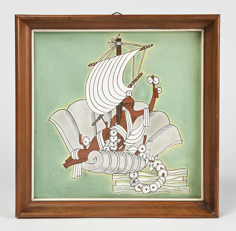 Giovanni Gariboldi (1908 - 1971) - Piastrella in ceramica policroma con decoro raffigurante una venere su conchiglia sospinta da una vela, produzione Richard Ginori San Cristoforo, Milano, circa 1938. Marcato al verso con monogramma (cm 23x23)