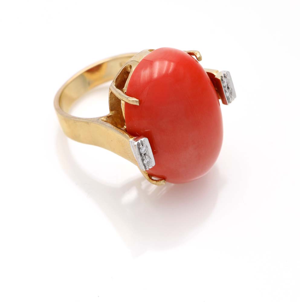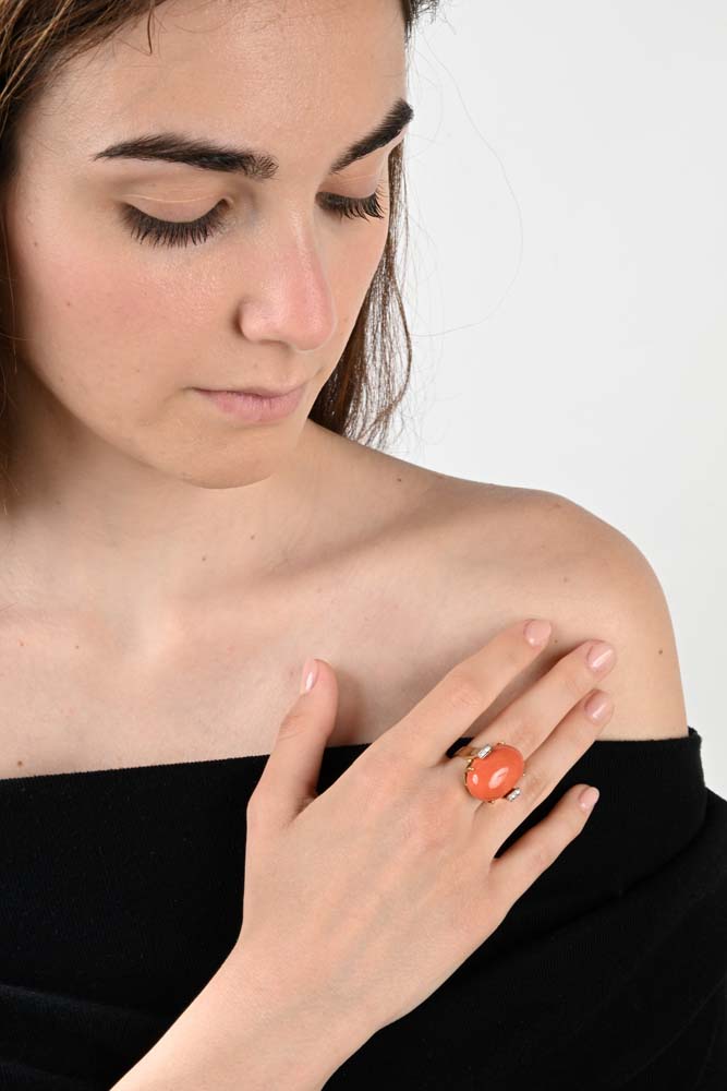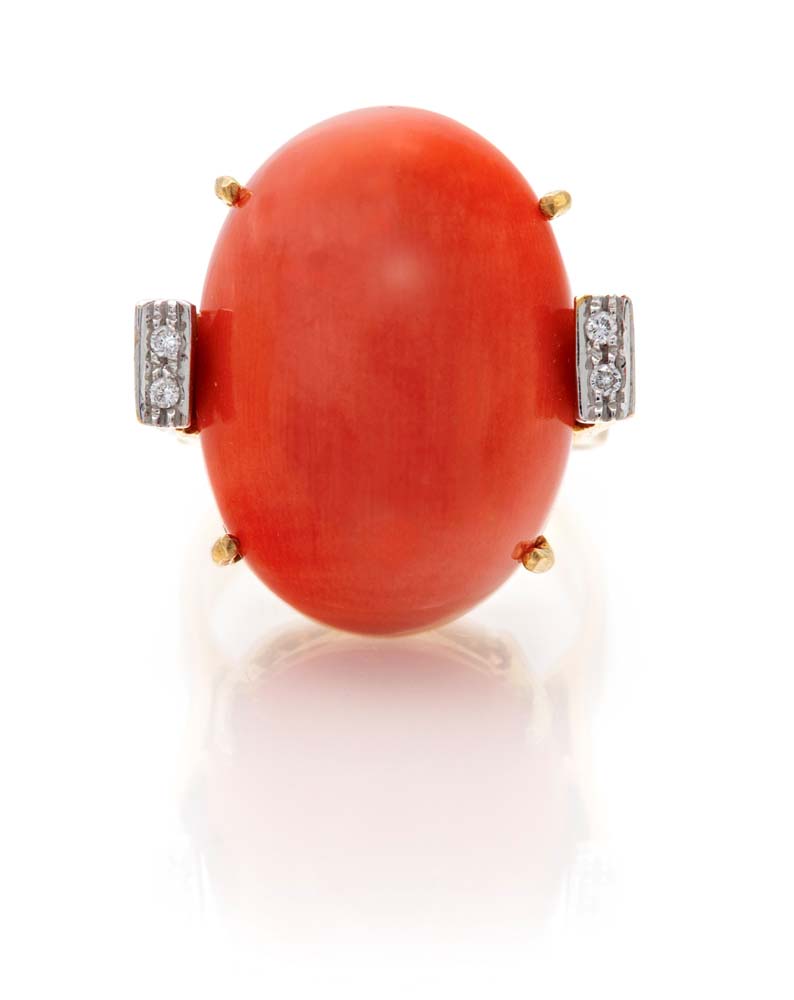 Rajola, anello in oro, corallo e brillanti Misura 14 Oro giallo e bianco 750/000. Peso complessivo gr. 13,50.